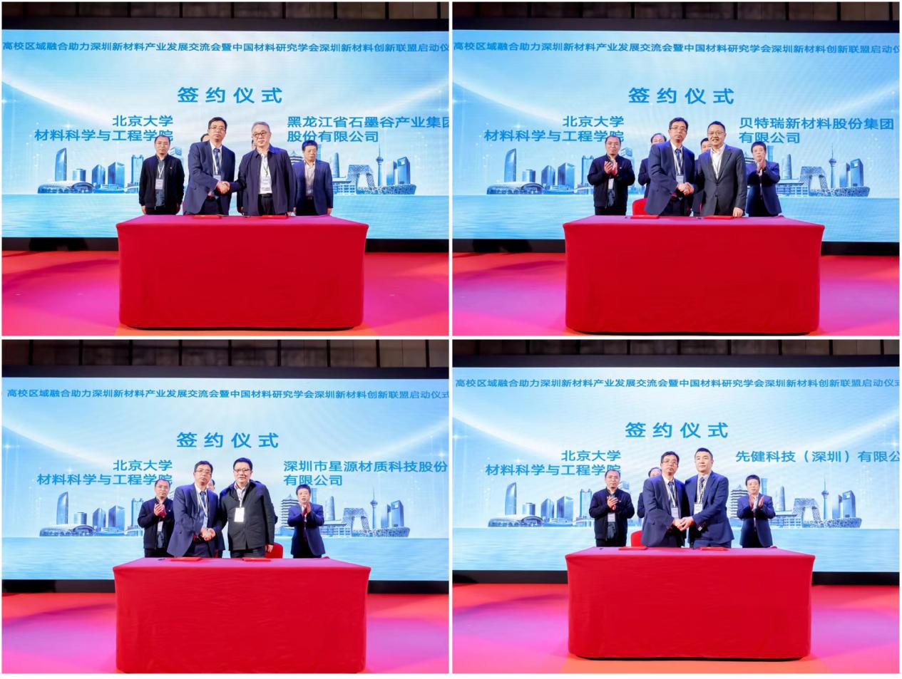 校企合作签约仪式上,北京大学材料科学与工程学院与黑龙江省石墨谷产业集团股份有限公司、贝特瑞新材料股份集团有限公司、深圳市星源材质科技股份有限公司、先健科技(深圳)有限公司签署了合作备忘录。根据备忘录,校企双方将在人才培养、学科建设、科学研究等方面展开深入合作。
