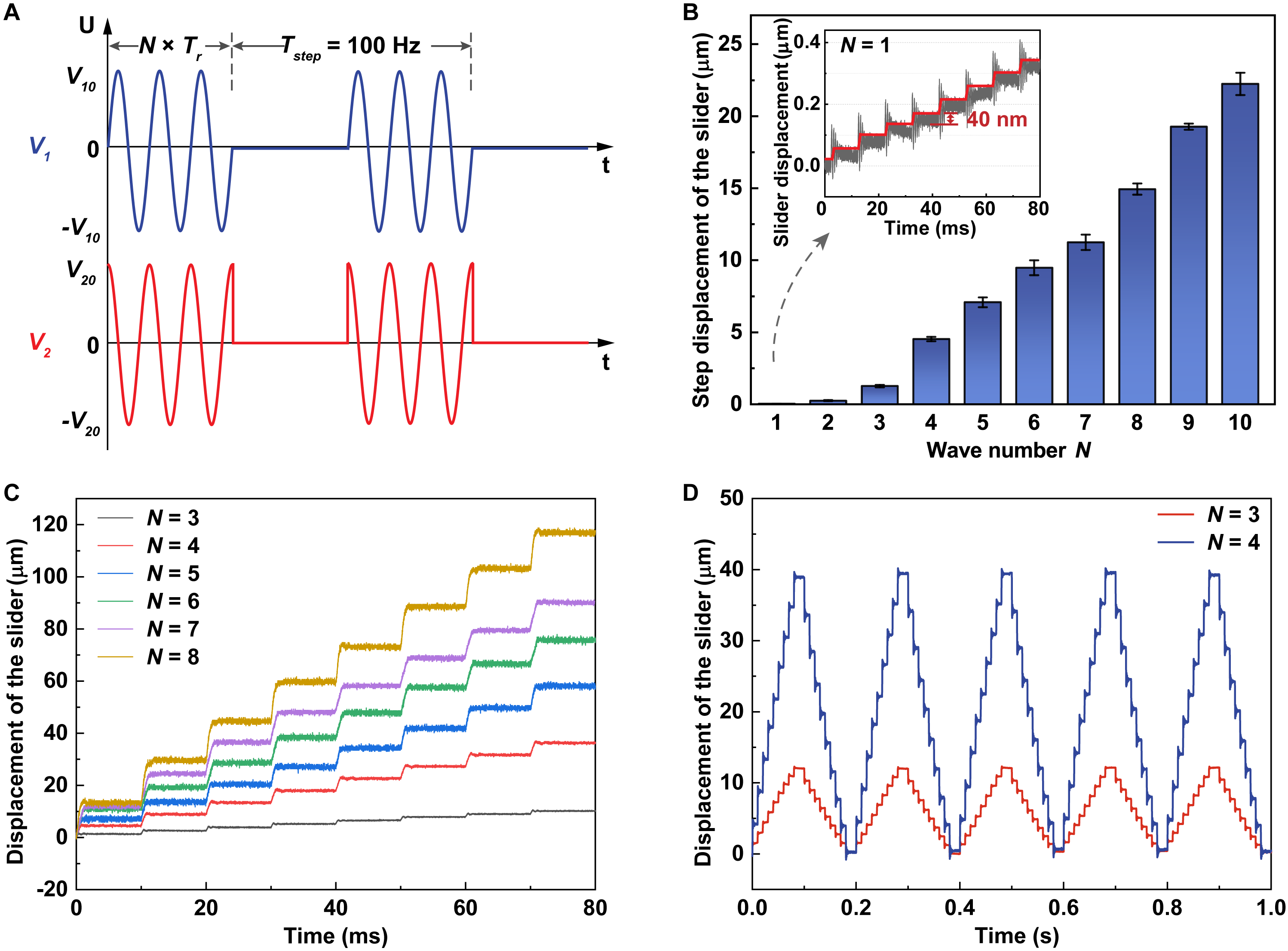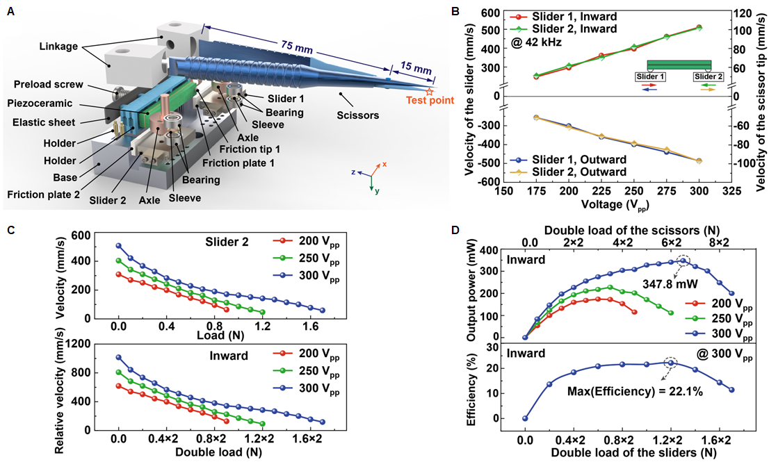 进一步地,将一副商用微创手术剪刀与该压电马达装配在一起,压电马达可以产生剪切功能,实现对微创手术剪刀的高精密对称操作,其具体结构如图3A所示。此外,产生的剪切效应又使两个驱动端部的输出力提高了若干倍。实验测试发现该马达有如下优势:(i)快的相对运动速度(~ 1 m/s);(ii)高的步进分辨率(40 nm);(iii)高的功率密度(405.4 mW/cm3),是已有报道的两倍以上;(iv)高的工作效率(22.1%);(v)宽的速度调节范围,见图4。