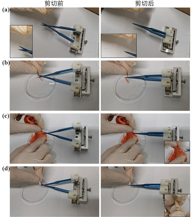 图5使用对称驱动压电马达操作微创手术剪刀剪切铜线(a)、猪肉丝(b)、牛肉片(c)和肠道组织(d)的图片