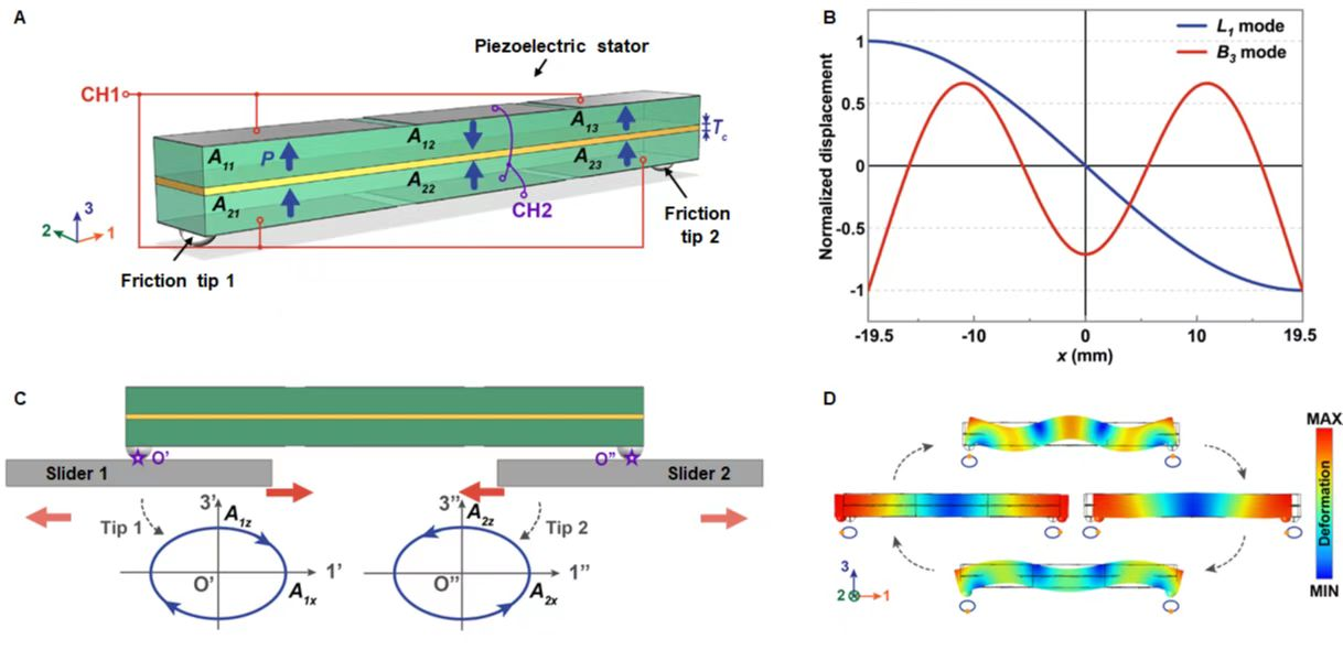 近日,董蜀湘教授课题组在压电微机电领域独辟蹊径:发明了一个压电马达,只需一个压电陶瓷,就可产生两个对称驱动和实现两个对称运动输出功能。而传统上,需要利用两个压电陶瓷(定子)来驱动两个动子和产生对称运动输出。本发明的压电马达,其基本思想是利用一块(2×3)序构压电陶瓷激发一阶纵振动模态和三阶弯振动模态,即L1-B3复合振动模态,如图1所示。这个振动模态在其两个端部产生方向相反的一对椭圆轨迹振动,进一步通过端部两个驱动头的界面摩擦耦合可以直接驱动一对动子(滑块),以相同的速度产生对称的、同步的向内或向外的直线运动。即无需额外的机械传动结构,同步实现驱动两个负载并产生对称的相向或者背向运动,见图2。发明的新的压电马达工作机制,对传统的一个压电定子只能驱动一个动子的工作原理做出了变革性的改变。同时,这种对称驱动机制使压电马达工作效率提高了一倍。