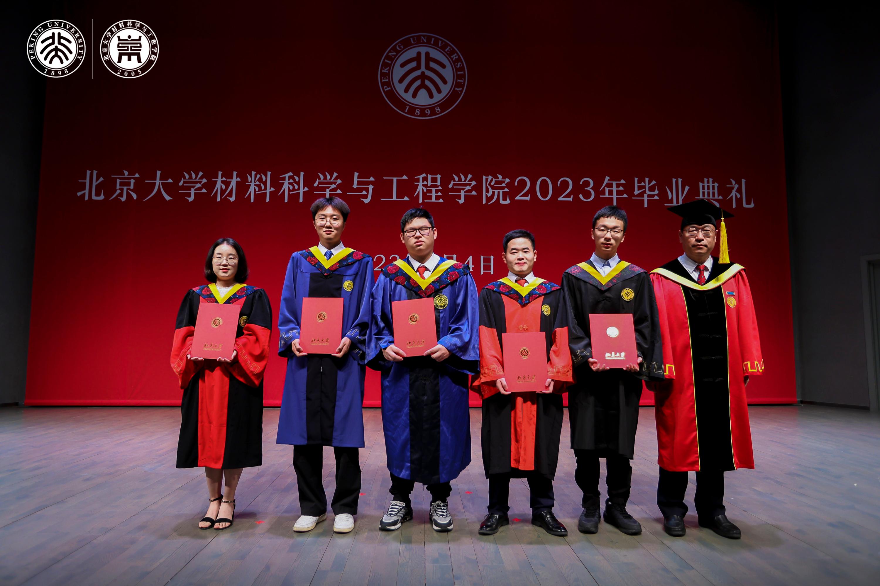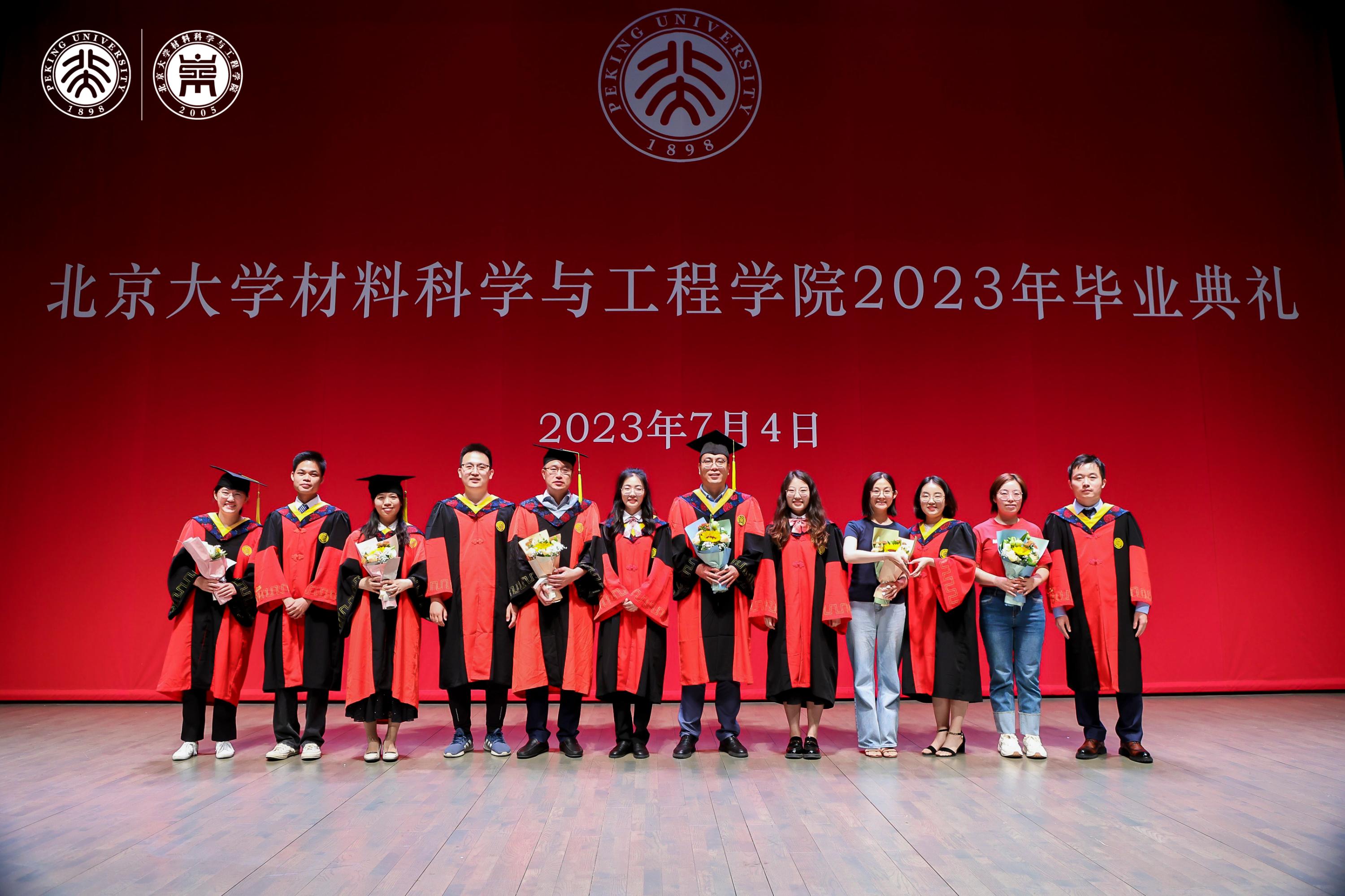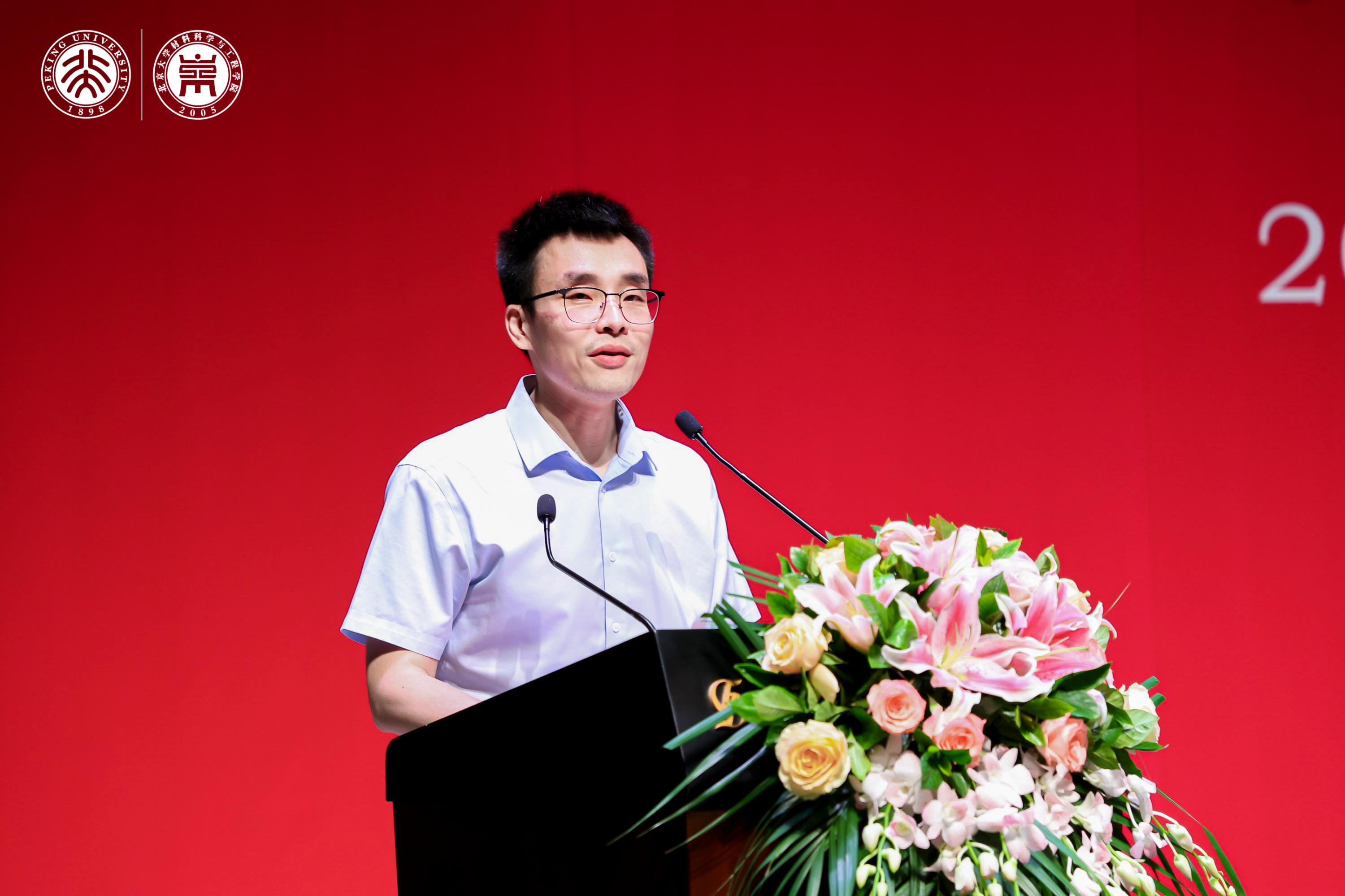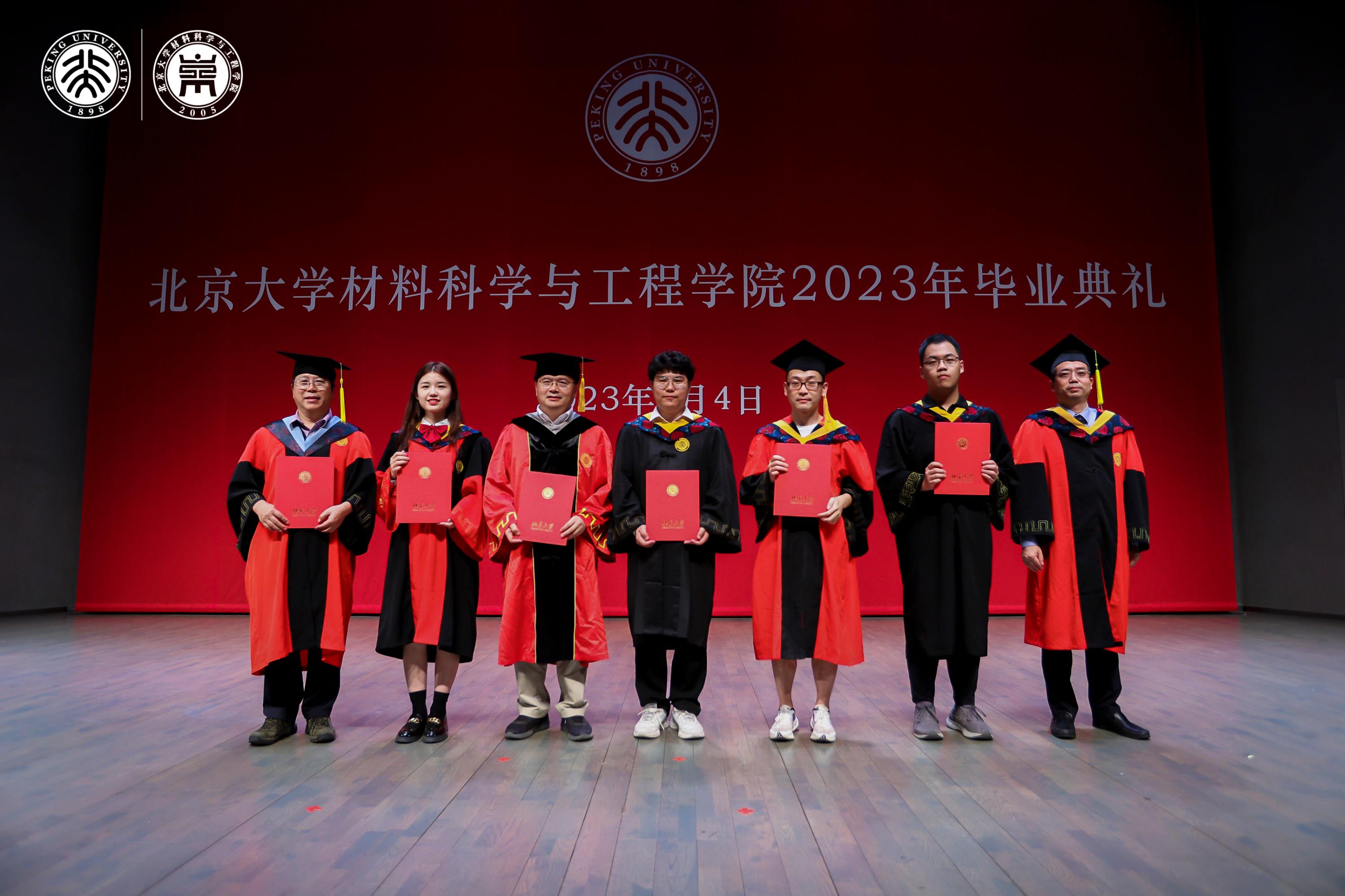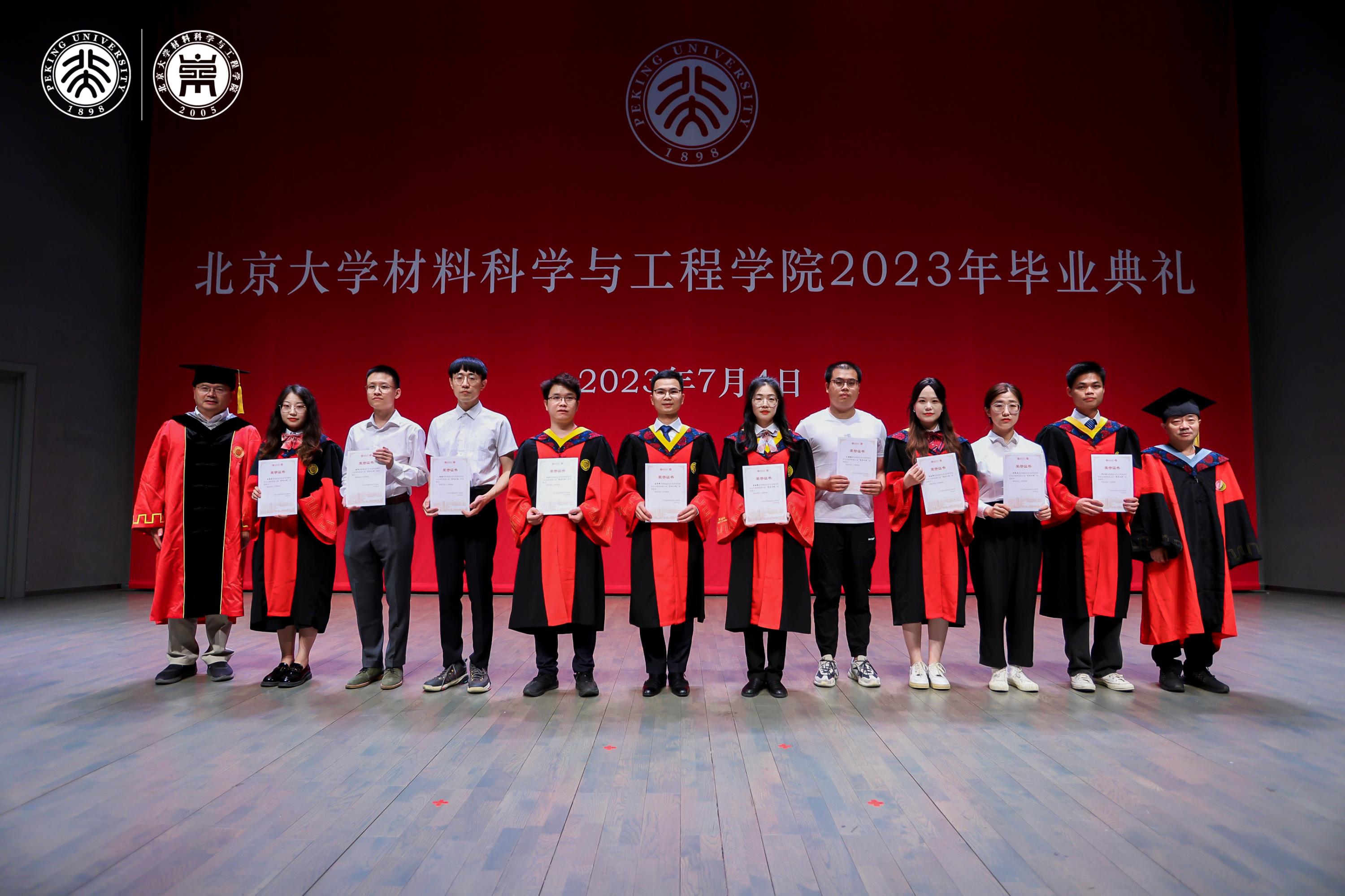 典礼上,张锦院士,新材料学院孟鸿教授、肖荫果副教授,材料学院曹安源教授、雷霆研究员等教师为获得“北京市2023年优秀毕业生”、“北京大学2023年优秀毕业生”、“2023年北京大学优秀学位论文”、“材料科学与工程学院第二届学术十杰”荣誉称号的同学和指导老师们颁奖。