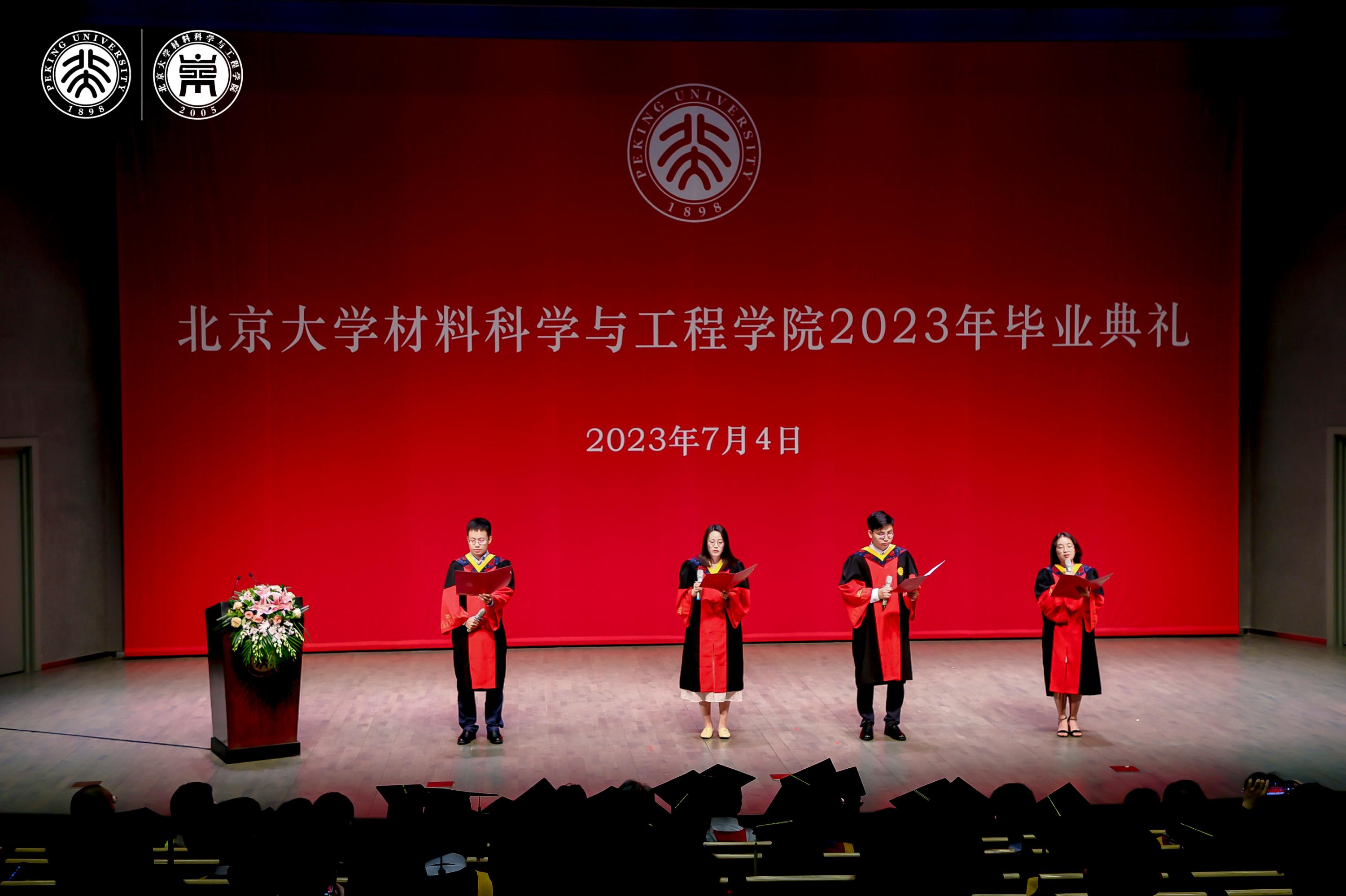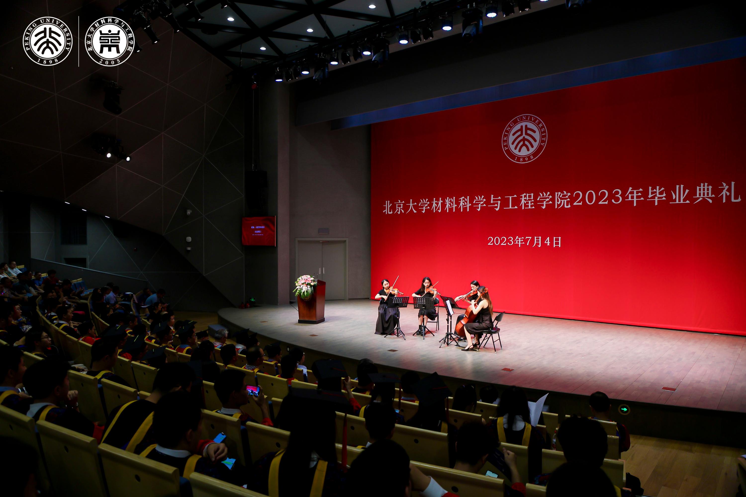 典礼开始前,北京大学提琴社奏响提琴四重奏《春》开启暖场环节。学院2023届博士班、硕士班毕业生制作的毕业纪念视频,表达了在材料学院学习的感想。4名博士生深情朗诵《永远的校园》,表达了对母校的感激之情和对未来的期盼。最后一曲提琴四重奏《永远同在》预告着典礼正式开启。