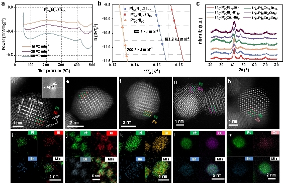 该论文提出了通过在PtM合金中引入低熔点金属(M'=Sn、Ga、In)弱化金属键强新策略,低温构筑有序化应变催化剂,在创纪录低温(450 °C)条件下实现了原子结构高度有序的L10-PtMM'(M= Ni、Co、Fe、Cu、Zn)金属间纳米晶的规模制备(单批次达10克)(图1)。