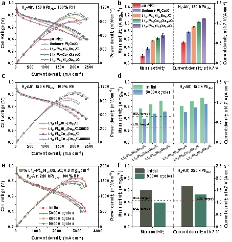 图3.原子结构高度有序的L10-PtMM'金属间纳米晶的氢-空气燃料电池