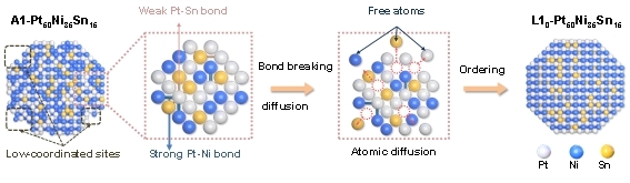 发展的原位表征技术,阐明了低熔点金属促进的无序-有序相转变新机制。该过程包括:i)低熔点金属掺杂弱化金属键强度,降低活化能;ii)表面低配位自由原子的形成和扩散;iii)低温下表面扩散诱导(110)表面L10相的成核;iv)L10相的持续生长及晶格压缩,直至形成高度有序的金属间结构(图2)。