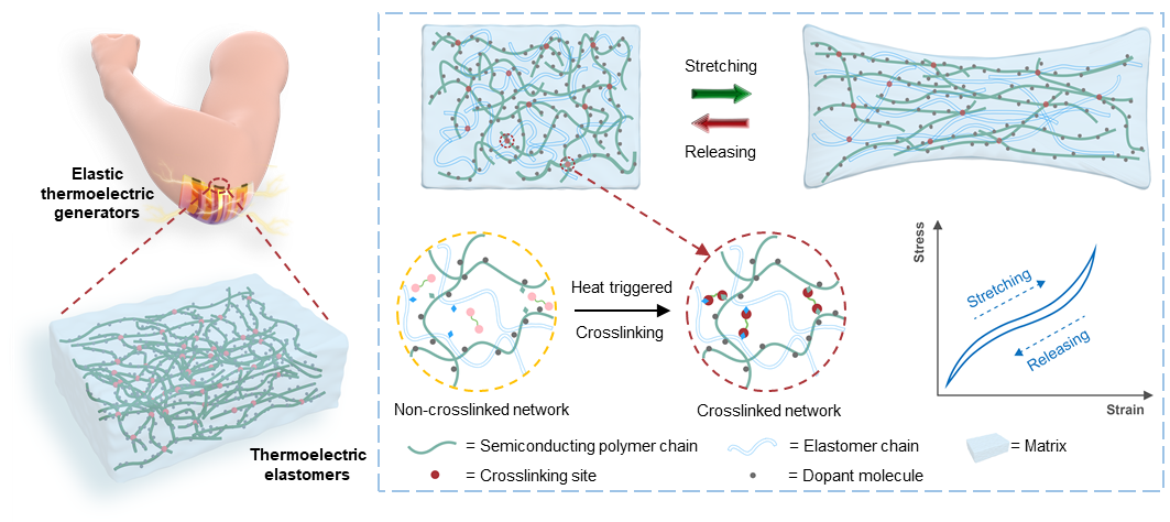 近年来,随着可穿戴电子器件与生物电子器件的快速发展,如何为柔性可穿戴系统提供兼具高效率、可持续性且高适形性的供能解决方案,成为制约该领域发展的重要技术瓶颈之一。热电器件能够将温差转化为电能,被视为实现可穿戴器件自供电系统的理想候选方案之一。此外,热电器件可通过通电实现制冷,对可穿戴制冷具有重要意义。传统无机热电材料(如Bi2Te3、PbTe等)因其优异的热电性能被广泛应用,但其本征脆性与不可拉伸性,使其难以适配柔性可穿戴设备的动态形变需求。尽管有机热电材料具有较好的柔性,但仍面临拉伸后无法回弹,性能衰减、块体材料模量高无法与皮肤共形接触等问题,难以保证在人体运动场景下的持续稳定发电或制冷。因此,开发兼具高效能量转换、持续供能能力和完美适形性的可穿戴热电系统,已成为热电领域亟待突破的重要挑战。