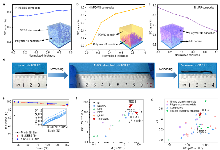 图2. (a-c) 共轭聚合物N1和绝缘弹性体(a)SEBS,(b)PDMS,(c)PU共混后体相纳米相分离形貌;(d) 基于共轭聚合物N1的热电弹性体材料拉伸-回复能力展示;(e) 共轭聚合物N1以及基于N1的热电弹性体在不同应变下的拉伸-循环性能(嵌入图为热电弹性体应力-应变曲线);(f) 热电弹性体和文献报道的N型有机热电材料的功率因子对比;(g) 热电弹性体和文献报道的柔性/塑性热电材料的ZT值对比。