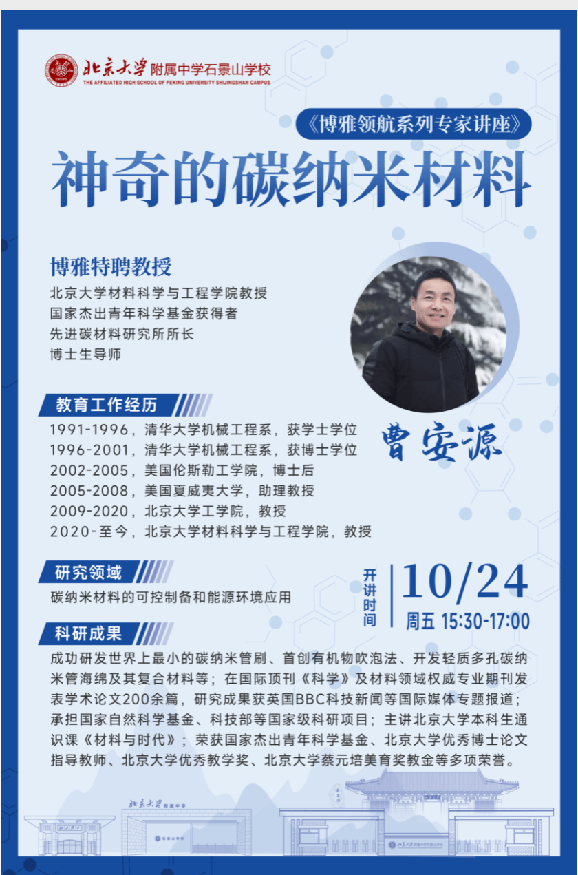 2025年10月24日,第二期《博雅领航系列专家讲座》在北京大学附属中学石景山学校顺利举办。本次活动得到了石景山区教委的大力支持,并在北京大学材料科学与工程学院院长邹如强、党委书记李明的共同指导下圆满完成。讲座特邀北京大学材料科学与工程学院博雅特聘教授、先进碳材料研究所所长曹安源担任主讲嘉宾。曹教授以《神奇的碳纳米材料》为题,为高中部师生带来了一场融科学性与趣味性于一体的精彩讲座。