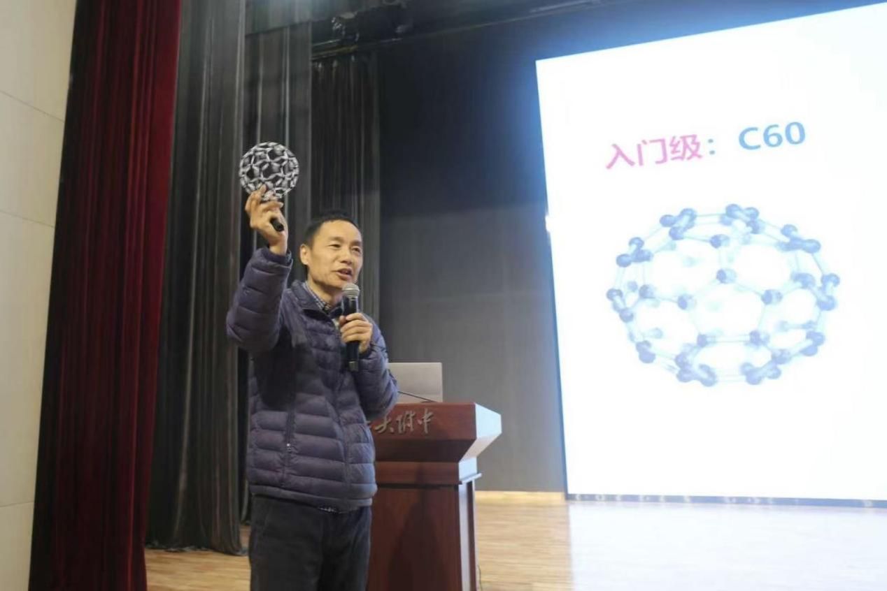 曹老师以诺贝尔奖相关成果为起点,运用通俗易懂、生动风趣的语言,系统介绍了富勒烯、碳纳米管、石墨烯等碳纳米材料的结构特征与核心性能。他结合自身学习与科研经历,将深奥的科学原理转化为贴近生活的实例,通过三维模型直观展示富勒烯的空间构型,并深入阐释了碳纳米材料在能源、航空航天、电子器件等领域的广泛应用。