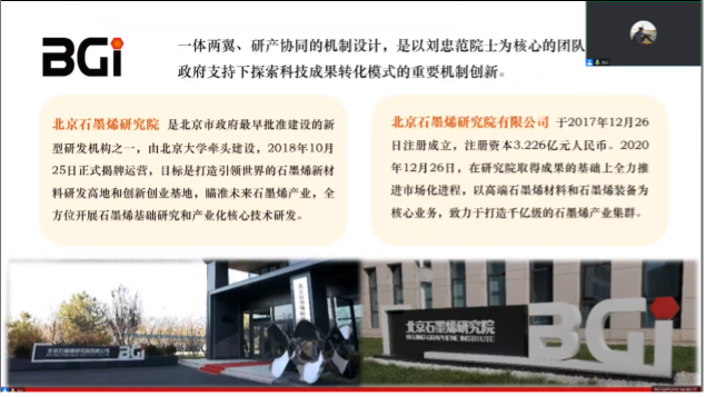 随后,许莉向大家重点介绍了北京石墨烯研究院——BGI。BGI脱胎于北京大学,在刘忠范老师的带领下,从2008年至今,在聚焦研发的同时,还致力于推动石墨烯材料的产业化,真正引领科技革命。BGI具有一体两翼的独特体制设计,研究院作为技术源头和技术支撑,打造石墨烯的技术高地;公司的使命是把石墨烯的研发成果推向产业化,同时从市场端反馈应用需求,用应用需求引导研发方向,研究院与公司相辅相成,具有完全一致的追求目标。BGI具有全球最大规模的石墨烯研发和产业化团队,旨在孵化一棵千亿级别的产业树,立足于研发的根基,培育产业树,孵化烯未来。