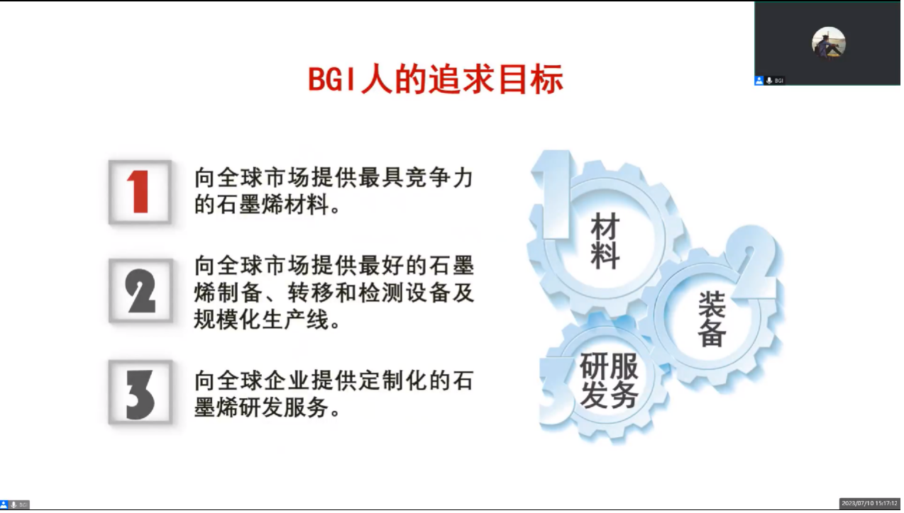 首先,许莉向大家简要介绍了二维材料石墨烯。石墨烯是由单层碳原子构成的蜂窝状纯碳材料,拥有诸多优异的性能,是一种非常神奇的材料,具有横跨不同行业、发挥不同作用的众多应用场景。石墨烯也被称为二十一世纪的战略新兴材料,许莉和众多BGI人相信石墨烯产业将是古老碳材料产业树的新枝,赓续碳材料家族的辉煌。
