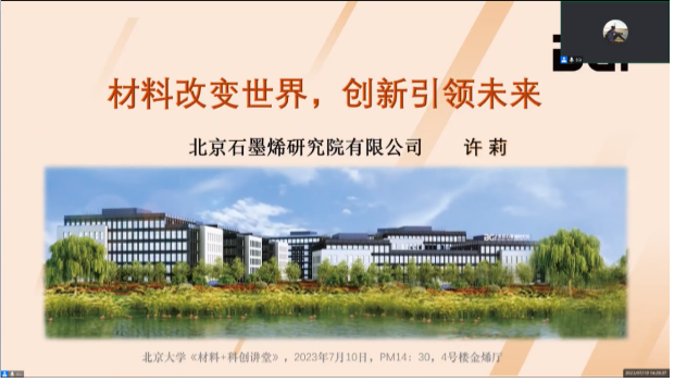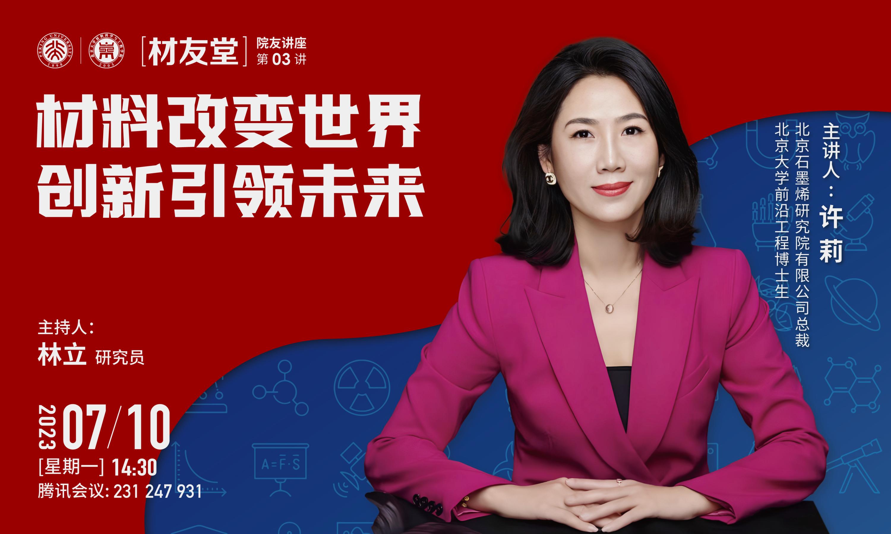 7月10日下午,“材友堂”院友讲座第三讲在线上线下同时举行,北京石墨烯研究院有限公司总裁、北京大学前沿工程博士生许莉带来“材料改变世界,创新引领未来”主题报告,学院师生线上线下约75人参加活动,讲座由学院林立研究员主持。