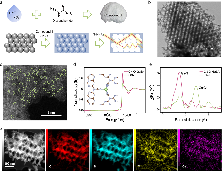 郭少军教授团队及其合作者设计了一类新型CNIO-GaSA光催化剂。CNIO-GaSA以氧化硅蛋白石为牺牲模板,以双氰胺与Ga(NO3)3为前驱体,经热裂解和模板去除等步骤制备而成(图1a)。催化剂所具备的周期性大孔结构(图1b),一方面可促使入射光在其内部发生多次折射、反射增加对光的吸收利用,另一方面可有效提升催化剂比表面积,促进水、氧气等反应小分子底物与催化剂活性位点之间的传质。球差校正高分辨电子显微镜证明Ga原子位在氮化碳载体上均匀分布(图1c)。同步辐射X射线吸收光谱揭示了单个Ga原子与5个临近N原子配位构成独特的Ga-N5活性位点(图1d&1e)。球差校正电子显微镜Mapping结果揭示了CNIO-GaSA中C、N、O和Ga元素分布均一(图1f)。