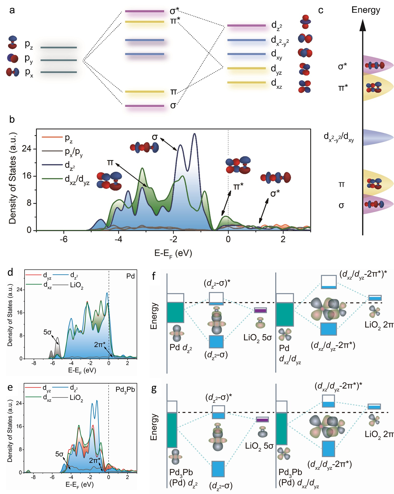 图3.Pd3Pb中Pd和Pb的分子内p-d杂化以及与LiO2之间的分子间轨道杂化。