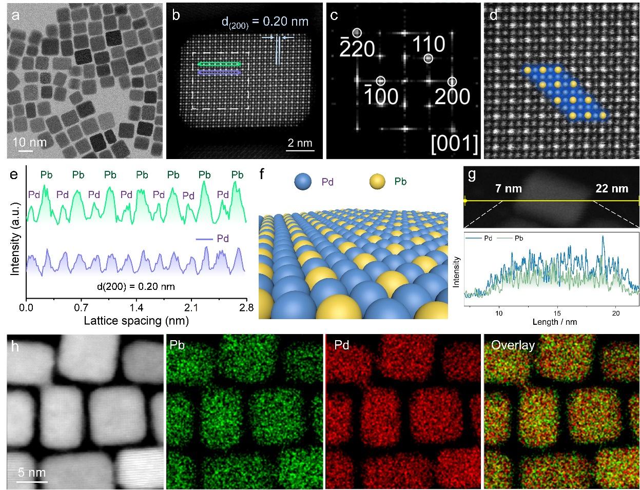 基于此,郭少军教授团队可控制备了直径为10-15 nm的金属间Pd3Pb立方体合金(图1a-c)。HAADF-STEM证实了有序的金属间Pd3Pb纳米晶体的形成(图1d-f)。TEM线扫和能量色散EDX元素分布证明了金属间Pd3Pb纳米立方体中Pd和Pb元素的均匀分布(图1g,h)。