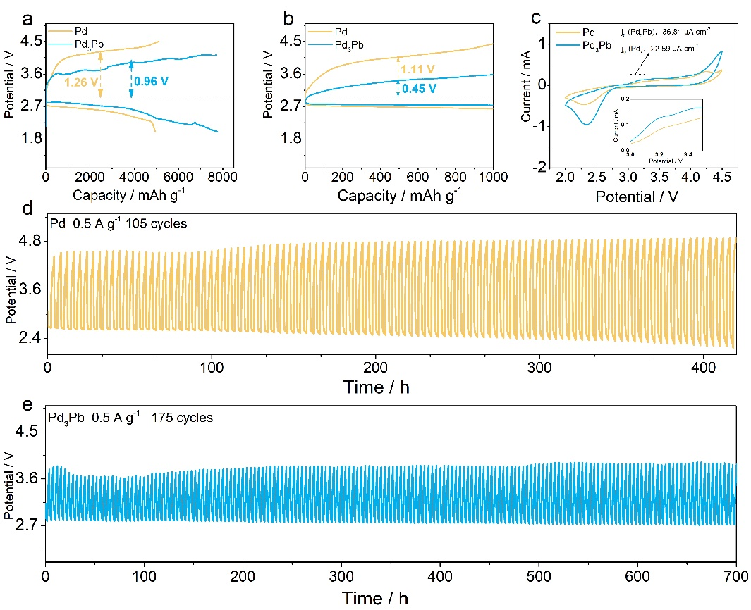 在全充全放条件下,Pd3Pb展现出高放电容量7,746 mAh g−1和低充电过电位(0.96 V),远优于纯金属Pd正极催化剂(图2a)。当截止容量为1,000 mAh g−1、电流密度为0.1 A g−1时,Pd3Pb正极材料的充电过电位仅为0.45 V (图2b),远低于Pd(1.11V)。同时,Pb3Pb的交换电流密度高达36.8μA cm-2(图2c),是Pd的1.67倍。当电流密度提高到500 mA/g,Pb3Pb金属间化合物正极材料仍能稳定循环175个充放电周期(图2e),稳定性高于Pd电极在相同条件下的100圈(图2d)。