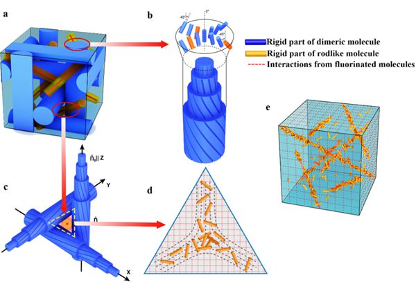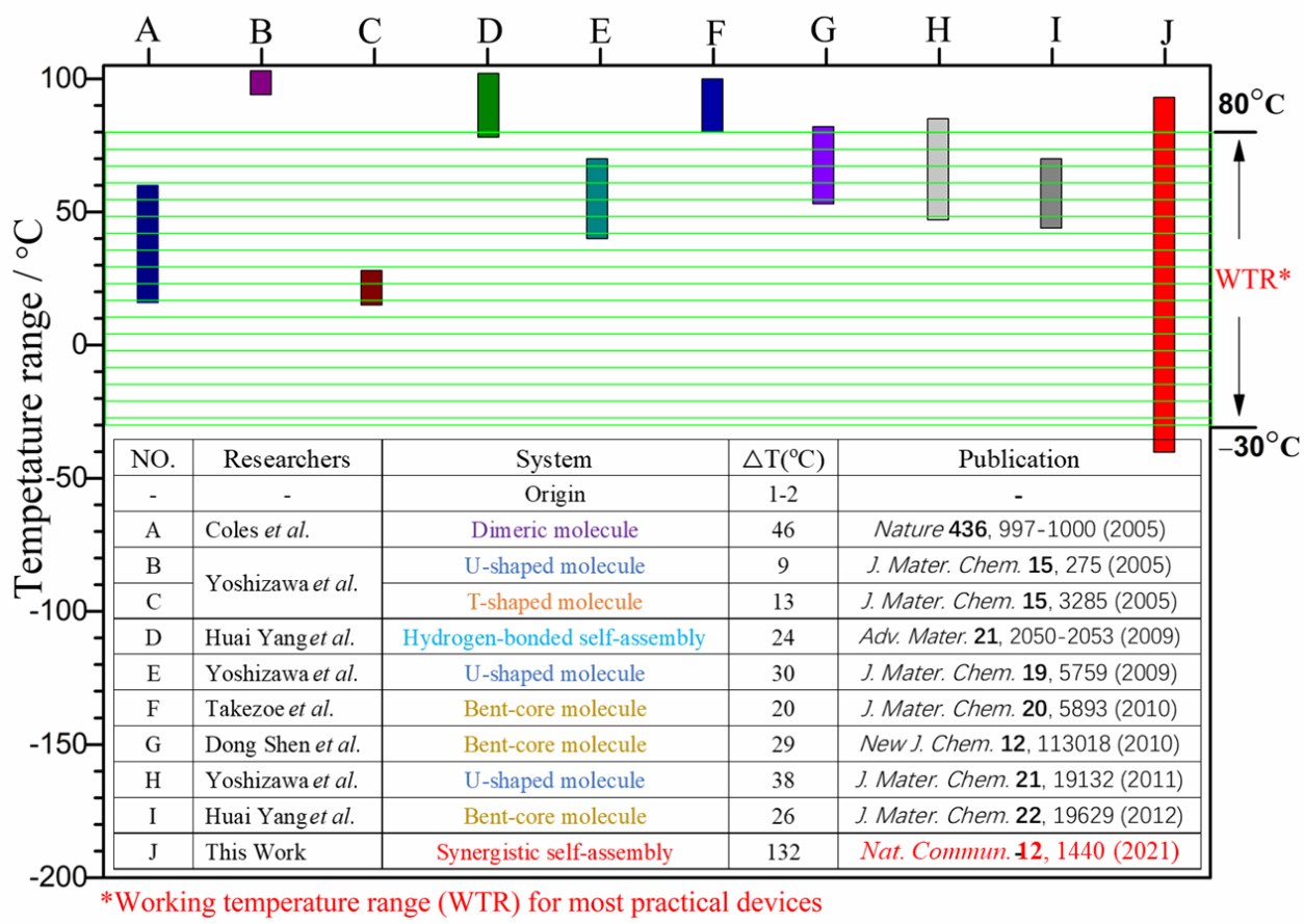 北京大学杨槐教授团队通过两种不同分子构型的液晶单体的协同自组装,棒状分子填充在蓝相液晶的向错线空间,降低了体系的自由能。首次制备出温域超过130.0℃(−39.6~92.8℃)的蓝相液晶材料,覆盖了显示器的工作温度(-30.0~80.0℃)。相关研究成果发表于《Nature Communications》(2021, 12(1): 1440),杨槐教授为文章通讯作者,北京大学博士后胡威为文章第一作者。