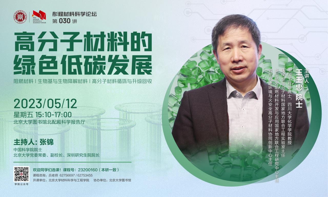 主讲人简介:王玉忠院士从事有机高分子材料研究,特别是在阻燃材料、生物基与生物降解材料及高分子材料循环与升级回收等领域取得了系统的基础和应用研究成果,被国际同行评价为是所研究领域的创新与学术思想的引领者(“innovation and thought leader”)。其发表的学术论文近5年SCI引用1.9万次,中国高被引学者,3项基础研究成果入选《国家自然科学基金资助项目优秀成果选编》;获授权发明专利180余件,专利实施应用有效解决行业瓶颈技术并取得显著经济效益,获四川大学首届“产学研合作年度杰出贡献奖”最高奖。王玉忠院士作为第一完成人,荣获了众多奖项。如:国家自然科学奖、国家技术发明奖和国家科技进步奖等国家和省部科技成果奖13项;何梁何利科技进步奖、四川省最高科技奖、四川省杰出人才奖、四川省教书育人名师、建党百年四川省优秀共产党员、四川大学首届最受学生欢迎教师奖;国家教学成果二等奖1项、四川省教学成果奖一等奖2项等荣誉。其领导的团队入选教育部创新团队和“全国黄大年式教师团队”。