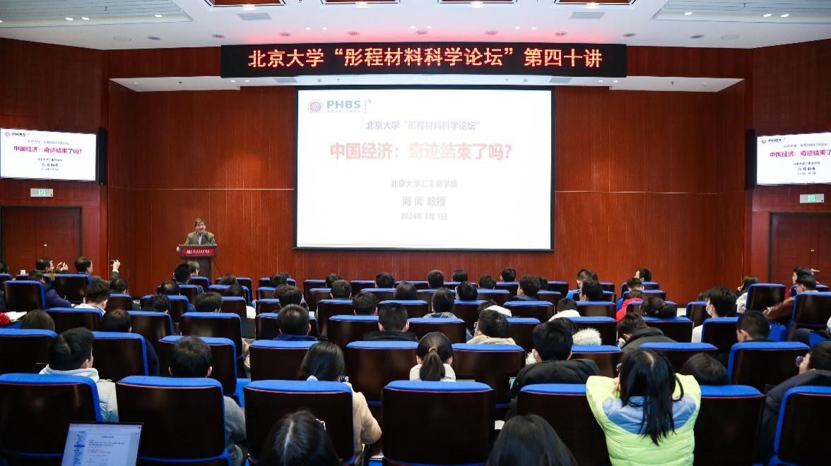 2024年3月1日下午,北京大学《彤程材料科学论坛》第四十讲于北京大学图书馆北配殿科学报告厅隆重举行。本次论坛邀请到著名经济学家、北京大学校务委员会副主任(原副校长)、北京大学汇丰商学院创院院长海闻教授,为大家带来了题为《中国经济:奇迹结束了吗?》的报告,北京大学副校长张锦院士主持并致欢迎辞。