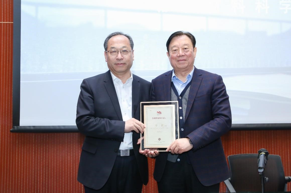 报告结束,干勇院士与现场同学作了进一步交流。张锦院士为干勇院士赠予《彤程材料科学论坛》授课证书并合影留念。