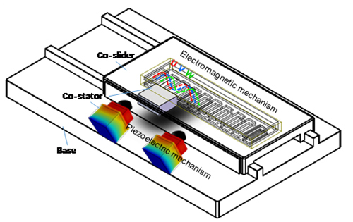 北京大学材料科学与工程学院董蜀湘课题组提出压电-电磁双机理解决方案,并发明了双机理多模态纳米直线运动电机(Dual Mechanism Multimodal Linear Actuator,简称DMMLA)。该发明通过共动子与共定子的设计把电磁和压电双机理结合在一起,再利用电磁机理产生宏观快速运动、压电步进机理产生微观低速运动、压电伺服实现纳观运动定位的三种运动模态,实现宏-微-纳全尺度运动精密定位。这种全新的双机理运动系统设计思路,可望有效克服传统各种单一机理马达或电机存在的问题,特别是在解决快速运动、不受局域限制的纳米定位精度的矛盾方面,具有独特优势,目前已申报中国发明专利。样机实测结果显示在电磁宏观运动时最大运行速度51.2 mm/s,压电步进微观运动时速度在0~135 μm/s,在压电伺服纳观运动时最小位移分辨率可达2 nm(开环控制)。相比传统单机理电磁运动平台或压电马达,在运动位移分辨率、运动速度等方面都有突出优势。提出的双机理纳米直线驱动设计方案为下一代超精密运动平台的发展提供了新思路。