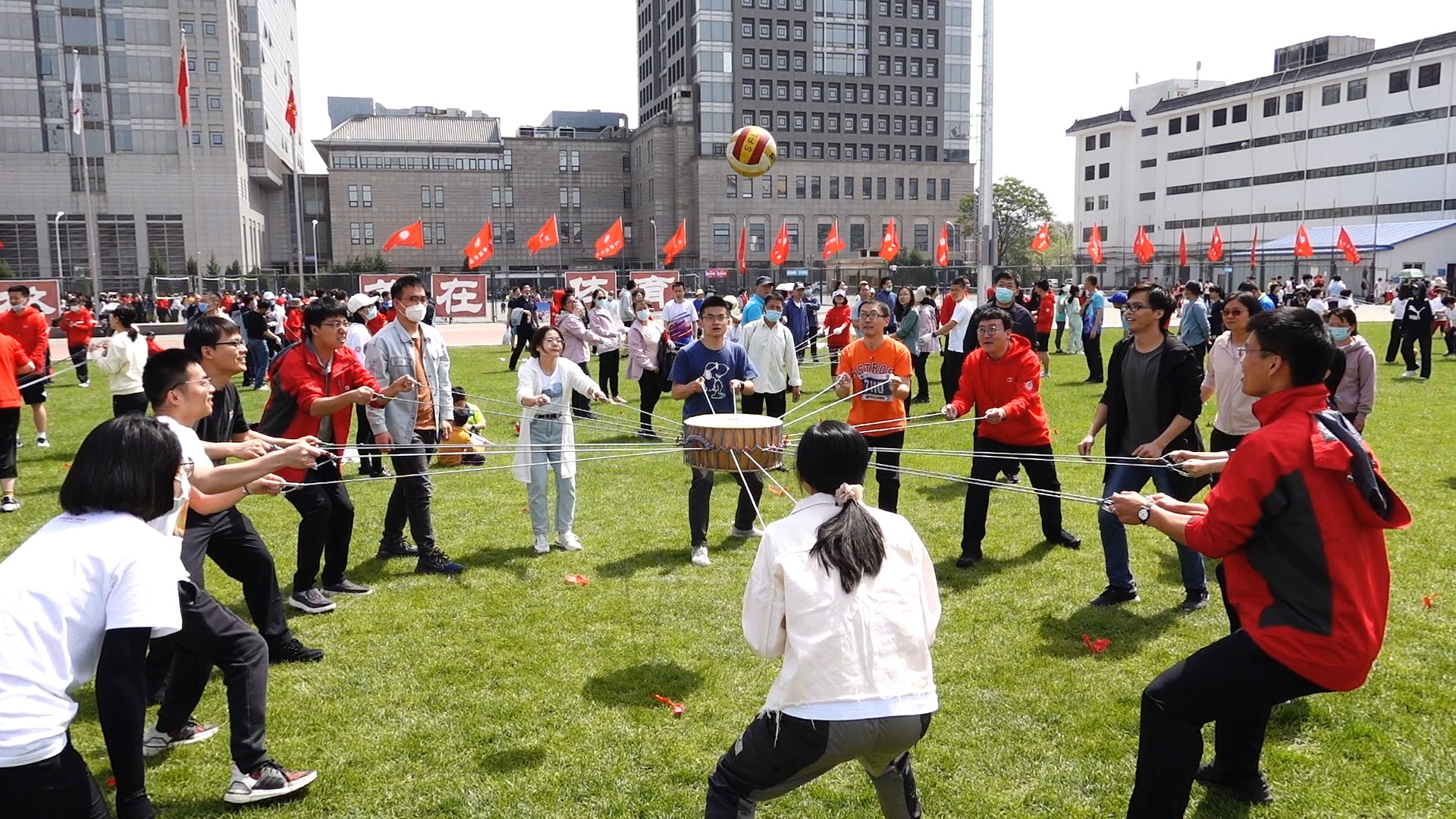 Pang Quanquan, Dou Jinhu, Xu Shenzhen, etc., a total of 9 people participated in the mixed teachers’ game “Volleyball on the Drum”.