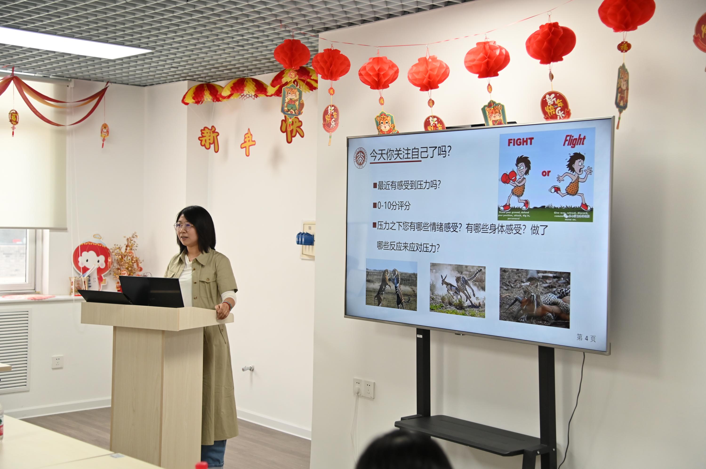 Sun Bo explained how to identify the students’ common psychological problems, how to deal with them and how to take good care of themselves. In addition, he taught students popularized psychological health knowledge and trained them through games and meditation. After that, Sun Bo briefly introduced the mental health status of students in PKU and the crises that happened in universities in recent years. He proposed that the difficulty of crisis intervention was not in the intervention itself, but in discovering the crisis and finding the opportunity to intervene. During the training, students actively expressed their own opinions. Through discussing actual cases, they learned about scientific psychological counseling methods and improved their ability to intervene in psychological crises.