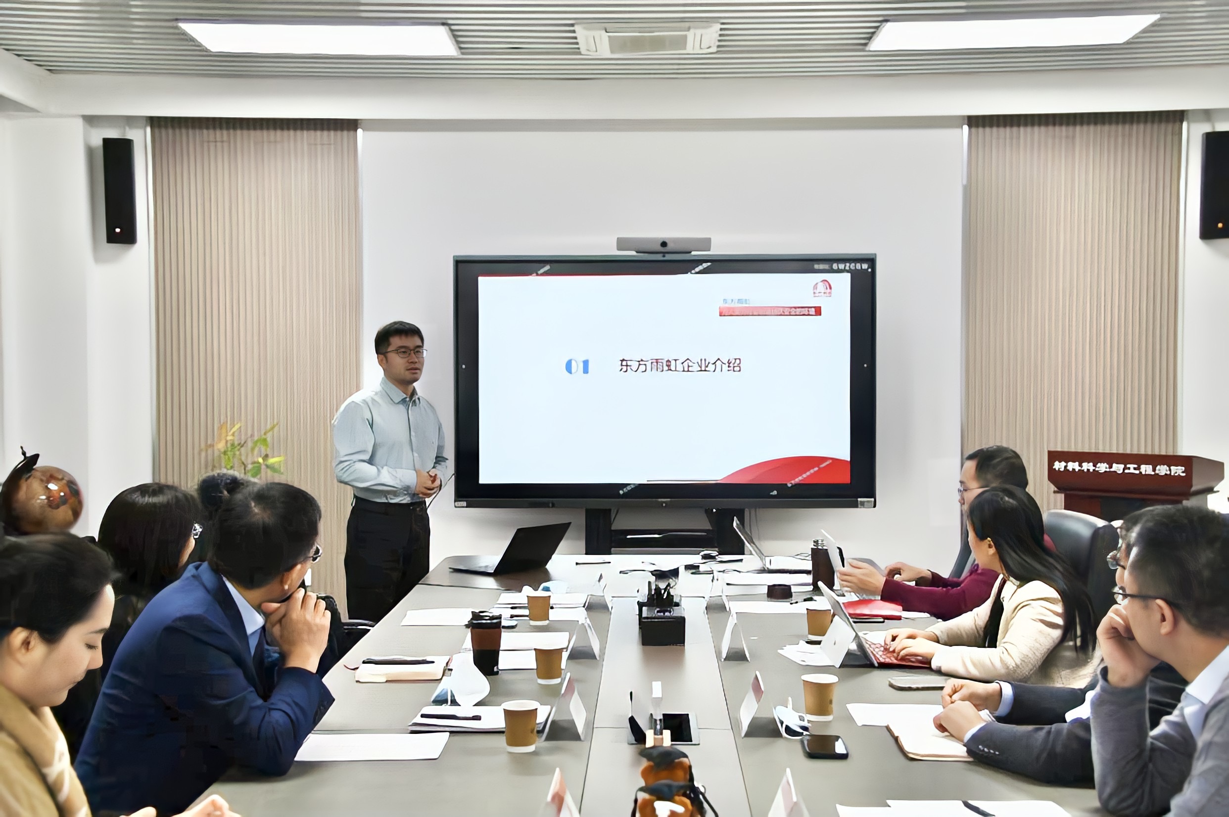 On January 12, 2023, Beijing Oriental Yuhong Waterproof Technology Co., Ltd. (hereinafter referred to as “Oriental Yuhong”) organized a symposium with Peking University. This symposium aims at promoting collaborative innovation between schools and enterprises. Xiang Jinming, the Vice Chairman and Executive President of Oriental Yuhong, Ding Hongmei, the Technical Director, Song Jianrong, the Director of Oriental Yuhong-State Key Laboratory of Special Functional Waterproof Materials, Zhang Man, the Manager of Public Affairs Department, Zou Ruqiang,the Secretary of the CPC School of Materials Science and Engineering Committee and the Dean of School of Materials Science and Engineering (SMSE), Guo Shaojun, the Deputy Secretary ofthe CPC School of Materials Science and Engineering Committee, Zhou Huanping, the Deputy Dean of SMSE, Lei Ting, the Assistant Dean of SMSE, Liu Jincheng,the Director of SMSE’s Officeand relevant personnel attended the symposium. This symposium was held in Room 137 of the Integrated Science Research Center and was presided over by Dean Zou Ruqiang.