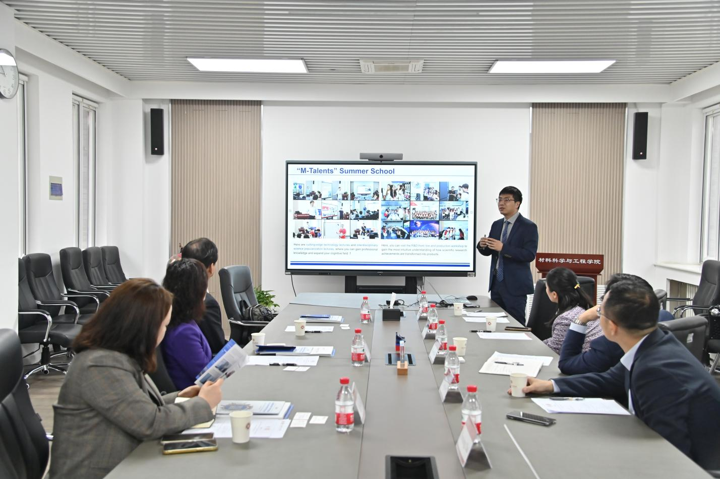 After the delegation watched the promotional video of the School of Materials Science and Engineering (PKU),Lei Tinggave a brief introduction to the history of the School, its development pattern of integration between Yanyuan Campus and Shenzhen Graduate School Campus, and then Leihighlighted the facultyresources, academic achievements, and five major research directions of the School.