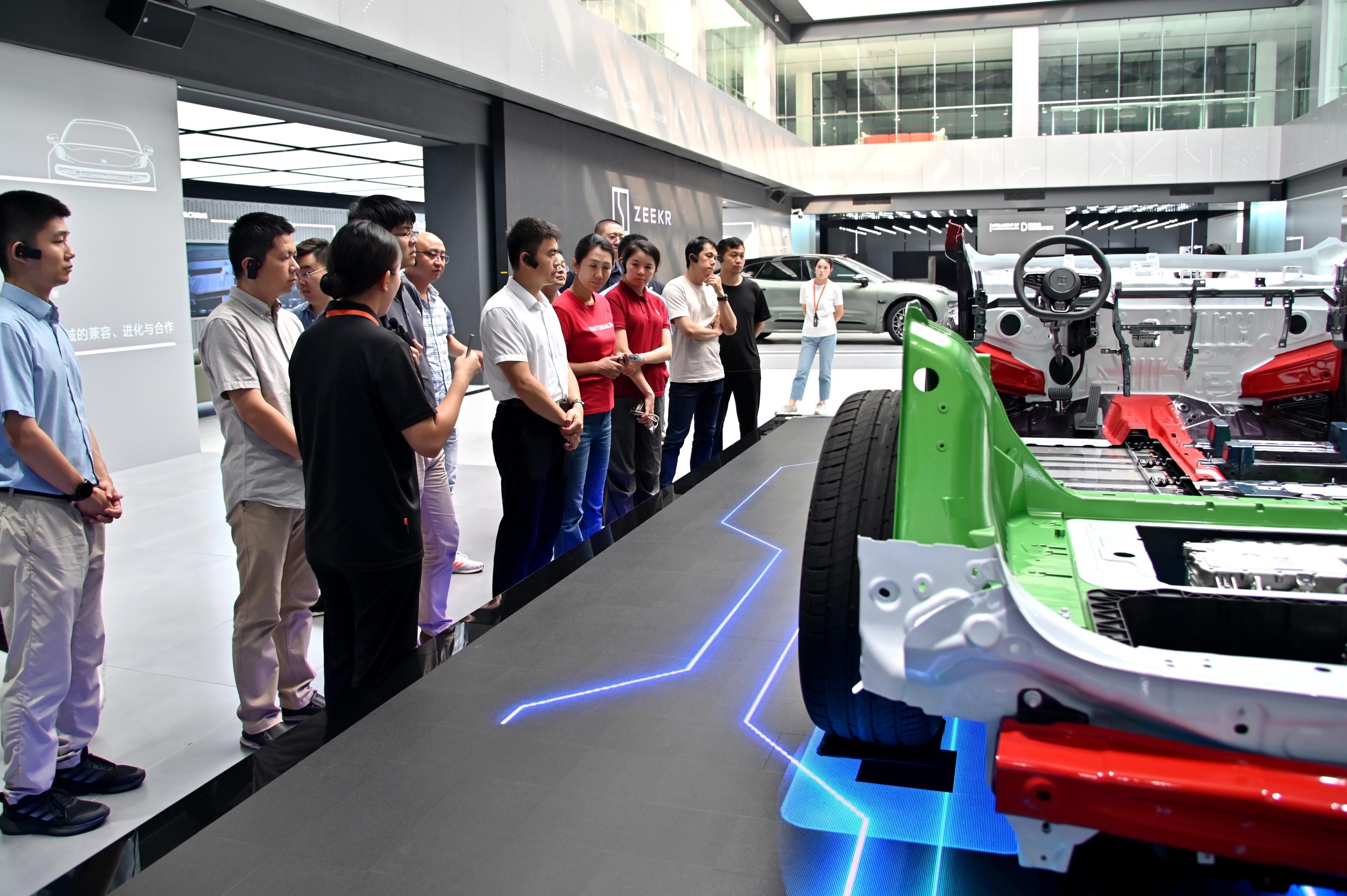 On the afternoon of September 29, faculty and students visited the Zeekr 5G Smart Factory. As one of Zhejiang Province‘s first intelligent manufacturing “Future Factories,” the Zeekr facility boasts the world’s first large-scale integrated die-casting L4-level smart production line. The site manager guided the group through thecompany’s exhibition hall, presenting the Zeekr brand, SEA (Sustainable Experience Architecture), smart manufacturing processes, safety testing, and intelligent cockpits. In the welding workshop, known as the “dark factory,” the team investigated the “unmanned” management model. In the final assembly workshop, they observed various production processes and witnessed the rollout of newly completed vehicles. Afterwards, they experienced test-drive and engaged in in-depth discussions with on-site professionals.