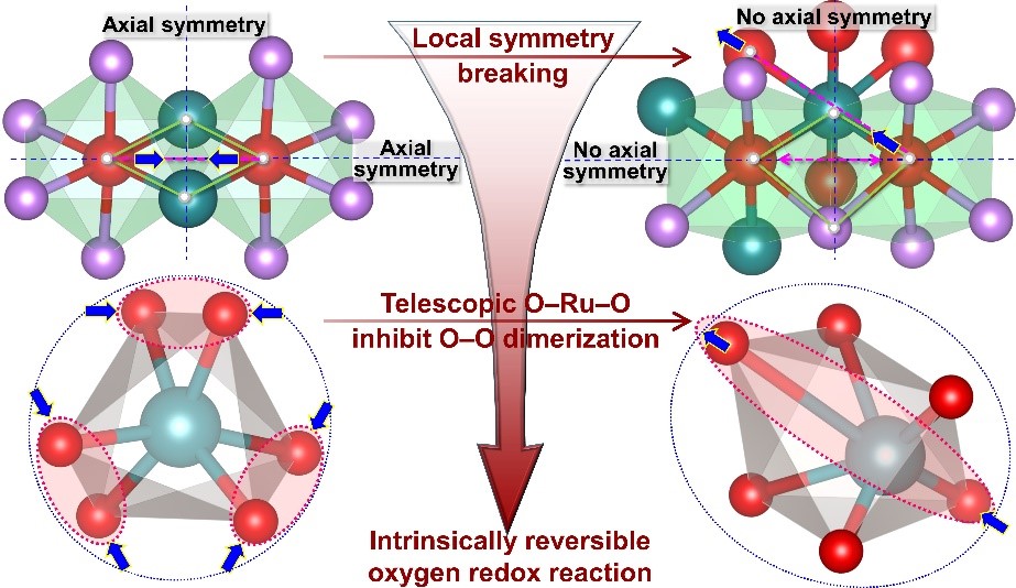 研究氧的局部对称性与阴离子氧化还原稳定性的关系,通过层内无序实现氧的局部对称性调控,提出一种新的阴离子氧化还原结构响应模式,发现对称性调制后,富锂材料在充放电过程中没有发生释氧,具有良好的充放电循环稳定性。(Nat. Commun., Fanghua Ning, Biao Li, Jin Song, Yuxuan Zuo, Huaifang Shang, Zimeng Zhao, Zhen Yu, Wangsheng Chu,* Kun Zhang, Guang Feng, Xiayan Wang,* Dingguo Xia,* 2020, 11, 4973.https://doi.org/10.1038/s41467-020-18423-7)。