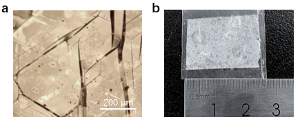 图1 (a) h-BN晶体的光学显微镜照片,(b)h-BN薄膜的照片。