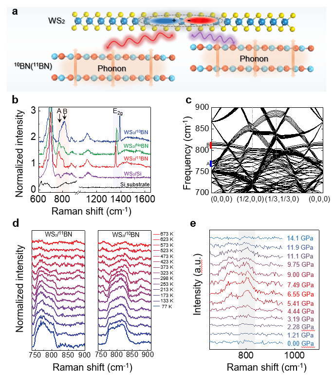 图2 (a) WS2/h-BN异质结中层间EPC的多级调控示意图;(b)激发光子与WS2中B激子共振时异质结的拉曼光谱;(c)单层WS2/6层h-BN异质结构的声子色散谱;(d)温度对异质结EPC信号强度的调控;(e) EPC的高压调控。