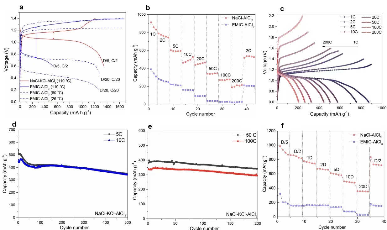 针对这一关键问题,北京大学材料学院庞全全团队及其合作者首次报道了一种高安全不可燃、超低材料成本、可实现快充的熔融盐铝电池。通过使用一种低熔点的无机氯化物熔融电解质,成功替代了当前的离子液体,实现铝电池的高倍率运行、低电压极化及高能量效率;同时熔融盐电解质的热稳定性高,不可燃,使得电池体系具有高安全性,解决了大规模集成系统安全性方面的疑虑。另外,该电池体系使用元素丰富的硫作为正极,在较低的温度110摄氏度下运行,表现出了高比容量及超快充特性。
