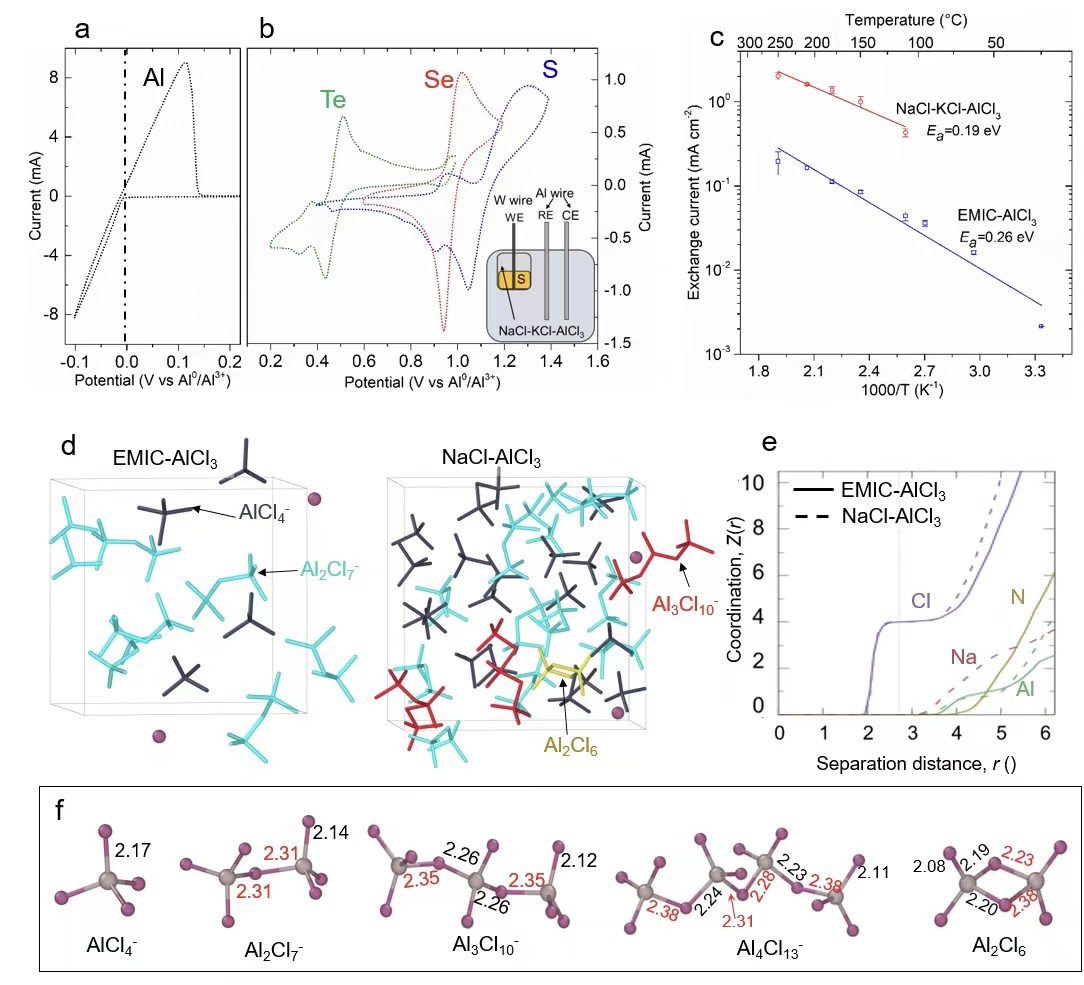 团队首先探究了在熔融盐电解质中铝负极的可逆沉积/剥离行为以及硫族正极(S、Se和Te)的本征氧化还原电化学反应,证明了熔融盐电解质在正极侧和负极侧均具有低极化、高反应可逆性。通过测试Al|Al对称电池在不同工作温度下Al沉积/溶解的交换电流密度,定量评价三元熔融盐和离子液体两种电解质的电荷转移动力学。结果分析表明在相同工作温度下,熔融盐电解质中实现的交换电流密度比离子液体高一个数量级,且活化能仅为0.19 eV,低于离子液体(0.26 eV),证明其具有更快的电荷转移动力学。进而采用拉曼光谱和核磁共振谱,结合分子动力学模拟,系统分析无机熔融盐电解质和离子液体中的团簇构型、铝离子配位结构及其脱溶剂化动力学,进一步揭示了无机熔融盐电解质具有丰富的高阶AlnCl3n+1–组分,更利于脱溶剂化,这是熔融盐电解液快速反应动力学和抗枝晶生长特性的根本原因。