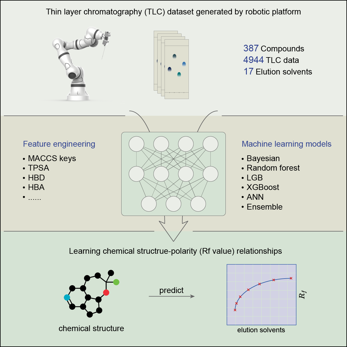 莫凡洋课题组搭建机器人平台,开发了TLC分析的自动化技术,获得了海量标准化的TLC数据,进而应用机器学习对数据进行回归分析,得到一个能够进行精准预测的模型。在实际应用中,模型能够在秒级时间内预测化合物在任意指定溶剂组合条件下的Rf值,从而避免大量试错,提高实验室工作效率。