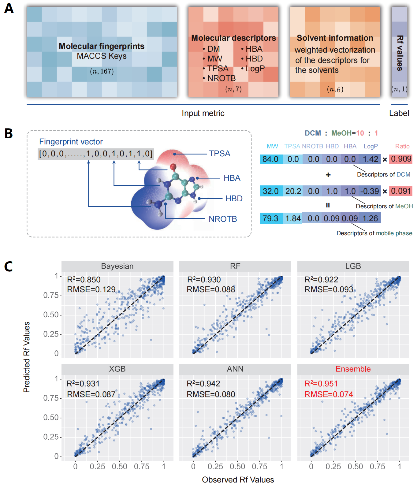 研究者利用MACCSKey分子指纹和物理化学描述符,如分子量(MW)、拓扑极性表面积(TPSA)、氢键给体数量(HBD)等,将分子转化为计算机可以处理的数值结构;采用加权向量化编码技术表示流动相信息。进行特征工程之后,研究者通过一系列常见的机器学习算法学习特征与Rf值之间的关系,取得了较好的预测精度。