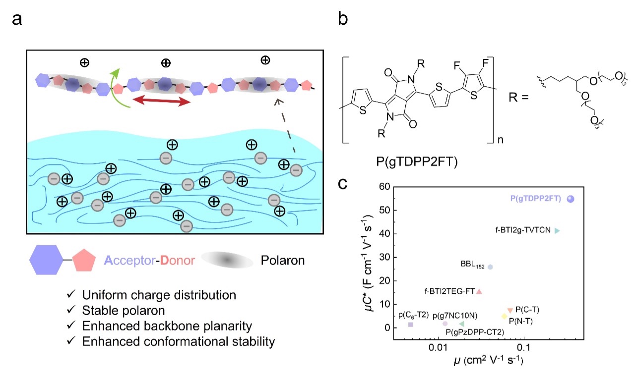 图2 a 本工作设计的“掺杂态调控”策略。b P(gTDPP2FT)聚合物材料的结构式。c 目前n型有机电化学晶体管材料的性能对比,本工作的P(gTDPP2FT)展现出最高的迁移率和μC*值。