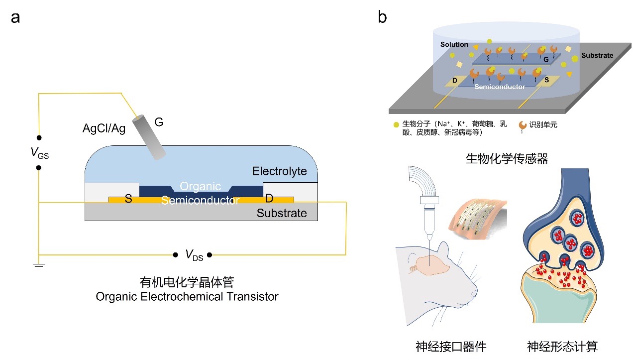 图1 a 有机电化学晶体管器件结构示意图;b 三种有机电化学晶体管应用:生物化学传感器、神经接口器件、神经形态计算。
