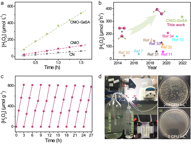 实验和理论计算研究表明,Ga-N5位点可有效吸附和活化水分子。另外,在两电子水氧化反应过程中,*OH这一关键中间体可以与Ga-N5位点中的Ga原子与N原子分别配位,降低了其反应形成能,优化了水氧化反应动力学。将光催化剂涂覆在自制石英微反应器的蛇型通道上用于过氧化氢的连续生产,发现在9次循环后,催化剂没有明显结构变化(图2c)。此外,在全光谱照射下,微反应器原位产生的过氧化氢可分解为强氧化性的·OH自由基,可有效杀死未名湖水中的细菌(图2d)。