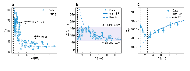 进一步,该工作从实验和理论两方面进行了探索,揭示了激子极化激元在实现亚微米连续激光源中的作用机制。亚微米尺寸钙钛矿中增强的光子−激子耦合作用导致群折射率显著增大至约80,进而大幅提升其模式增益以补偿模式损耗。同时,这也导致钙钛矿亚微米激光源可具有更高的有效微腔品质因子和更窄的发射线宽(图2)。该机制也为开发基于其他半导体材料的小尺寸低阈值激光器提供了新见解。