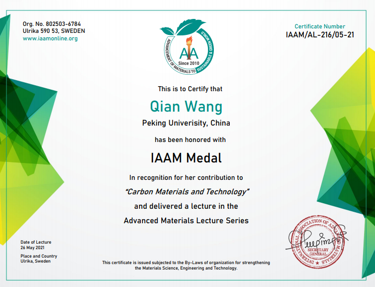 近日北京大学材料科学与工程学院王前教授荣获国际先进材料协会(International Association of Advanced Materials, IAAM)颁发的IAAM Medal,以表彰她在碳材料领域所做出的贡献。