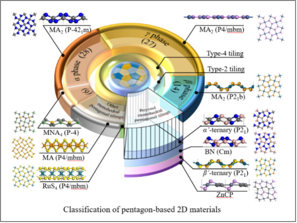 更为重要的是五边形石墨烯为二维新材料的研发提供了新的原子结构模型。受五边形石墨烯的启发,数以百计的仅以五边形为结构单元的二维新材料被理论预言或实验合成(如五边形硅烯纳米带、五边形二硒化钯等成功合成)。这类材料由于其特殊的原子构型,因而具有诸多新颖的物理、化学特性,如s-p能带反转、高载流子迁移率、铁磁性、拓扑半金属性、拓扑半绝缘等,在纳米电子学器件、光催化水分解、二氧化碳的催化转化、超级电容器、金属离子电池等方面表现出广泛的应用前景。王前课题组建立了五边形二维材料数据库,并对已发现的102种不同晶体结构的二维五边形材料进行了分类研究(如下图所示)。五边形型石墨烯的发现有力地推动了新型二维材料的研发。