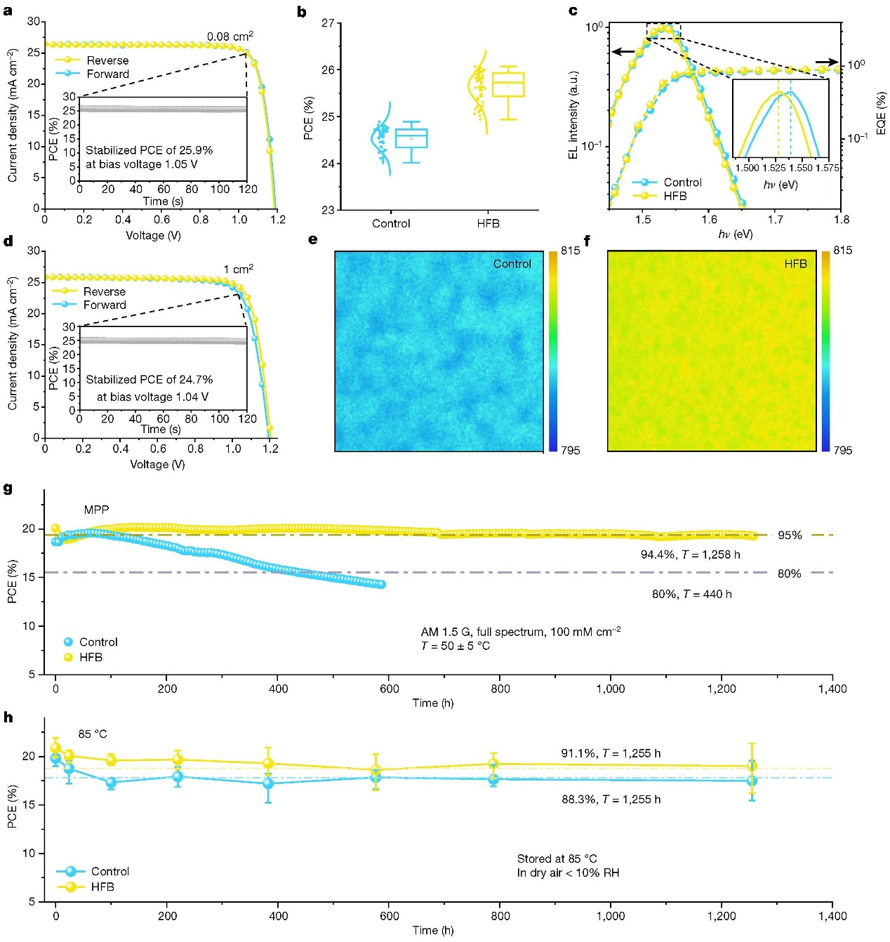 此外,这种基于AX组分位点的调节方法与传统基于BX2组分位点的调节方法独立生效,且可协同发挥作用,因而可实现材料双位点生长调节。巧妙的是,不同于通常单一位点调节方法形成的中间相,该双位点调节所形成的中间相不是结晶态,而是更接近于湿膜状态,因而实现了在反应温度下直接由湿膜形成最终的钙钛矿晶体,而不经历其他高结晶度的中间相。因此,该方法制备的钙钛矿薄膜的组分纯度和相纯度显著提高,尤其是微区的化学异质性和纳米尺度相杂质被消除。该方法制备的钙钛矿材料的载流子寿命增长,结晶度提高,带隙红移,吸收增强。小面积钙钛矿光伏器件(0.08 cm2)光电转化效率达到26.04%,认证值为25.8%。大面积器件(1 cm2)实现了24.63%的光电转化效率。此外,由于材料组分纯度和相纯度的提高,器件的热稳定性和运行稳定性大幅提高,在最大功率点追踪1258小时后,仍保持了初始效率的94%;在85°C加速老化1255小时后,仍保持初始效率的91%。该方法可提高钙钛矿材料的纯度及晶体质量,可推广至其他的钙钛矿光电器件,且在前驱体中引入阴离子-π相互作用及双位点生长调控的思路,对于其他包含缺电子离子和富电子离子材料的生长调控也具有重要参考意义。
