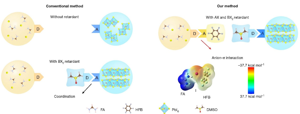 为实现更为可控的钙钛矿薄膜生长,北京大学材料科学与工程学院周欢萍课题组突破基于阳离子B位配位相互作用的传统思路,提出了全新的方法。基于阴离子-π相互作用,引入缺电子受体与钙钛矿中的阴离子X位结合,精准调控合成反应动力学,获得了更高质量的晶体,有效抑制了纳米与原子尺度缺陷。尤其是阴离子-π相互作用与配位相互作用分别针对两个独立的反应物位点,为钙钛矿薄膜的可控生长提供了全新的调控工具。研究成果以“Anion-π interactions suppress phase impurities in FAPbI3solar cells”为题,于2023年10月18日在线发表于《自然》(Nature)期刊上(doi: 10.1038/s41586-023-06637-w)。
