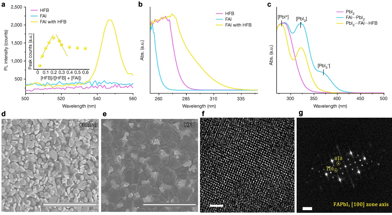 图二:阴离子-π相互作用的存在性和效果。a,b,FAI、六氟苯及其混合物的荧光光谱(a)与吸收光谱(b);c,PbI2, FAI···PbI2混合物及PbI2···FAI···HFB三元混合物的吸收光谱;d,e,引入阴离子-π相互作用前后钙钛矿薄膜的扫描电子显微镜图像;f,g,引入阴离子-π相互作用的钙钛矿的透射电子显微镜图像(f)及电子衍射图案(g)。