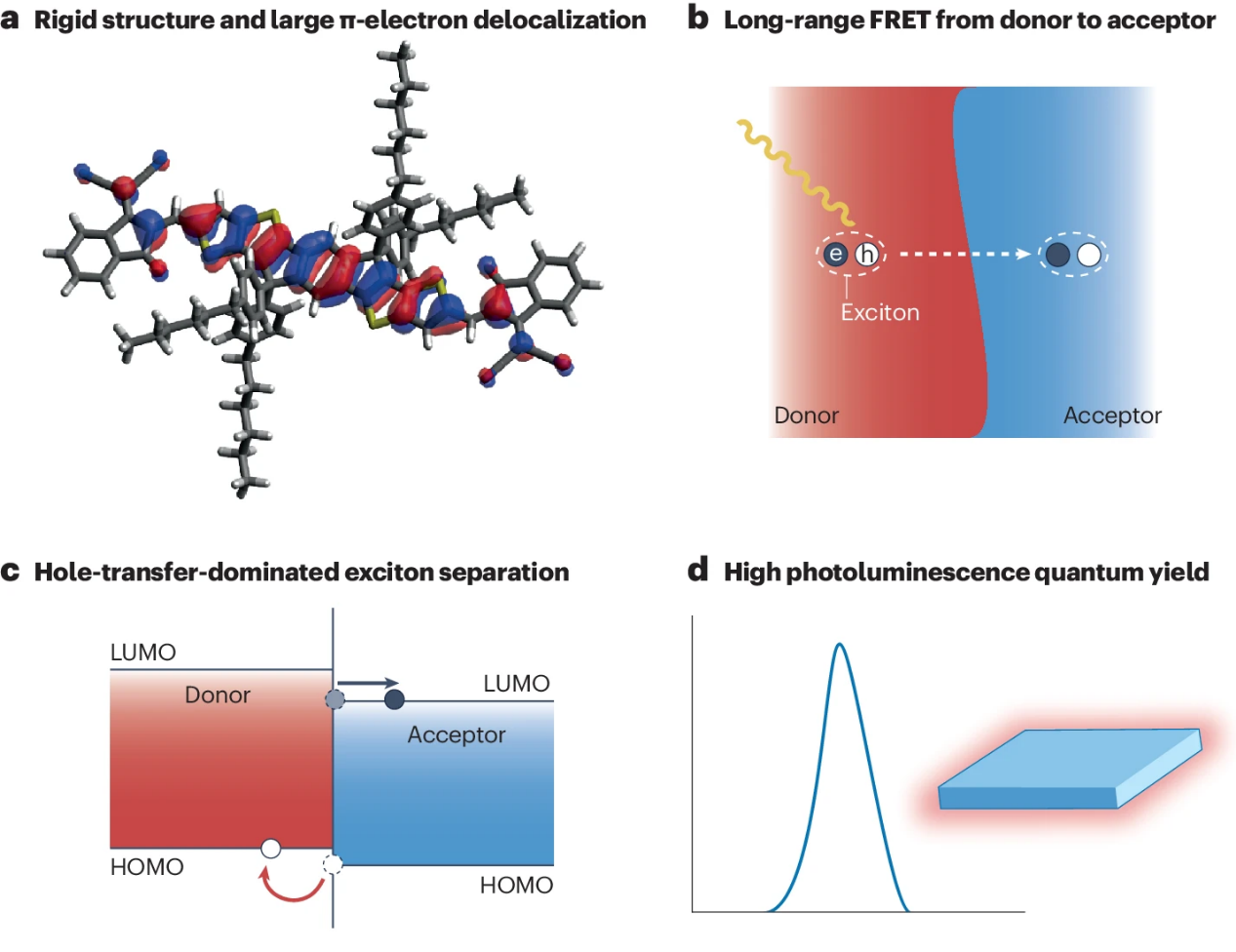 太阳能电池是一种将安全、绿色、可再生的太阳能转换为电能的器件。有机太阳能电池是一类基于有机半导体为光活性材料的太阳能电池,具有原料资源丰富、制造成本低廉、质量功率密度大、环境友好、可半透明、可采用卷对卷印刷制备大面积柔性器件等突出优点,在建筑光伏等分布式光伏和物联网器件、可穿戴器件等“光伏+”应用方面前景广阔,可助力实现国家“双碳”战略目标。2015年以前,有机太阳能电池的电子受体材料由富勒烯及其衍生物主导。2015年之后,非富勒烯受体,尤其是具有开创引领性的稠环电子受体迅速崛起,有力推动有机太阳能电池的效率突破20%,已接近晶硅太阳能电池的水平,推动领域进入“非富勒烯时代”。非富勒烯受体迥然区别于富勒烯受体的基础光物理、光化学、电子结构、光学性质及其对整个激发态性质和过程的影响,是支撑其性能实现突破的重要原因。