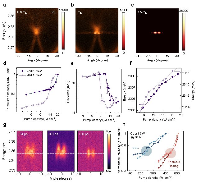 在室温脉冲光泵浦下,研究团队利用自搭建的角分辨荧光/反射光谱系统及迈克尔逊干涉装置,对发射强度非线性增强、线宽窄化、峰位蓝移和时空相干性等进行了细致研究,进一步证实了室温下BIC激子极化激元凝聚的实现。团队基于自搭建的超快光学Kerr门控系统,对角分辨光谱进行时间分辨分析,探究了室温BIC激子极化激元凝聚建立的动力学过程。团队进一步研究了在低温准连续光泵浦下,低阈值操作能力,结果显示,与普通光子激光相比,BIC激子极化激元凝聚的阈值降低了一半以上。