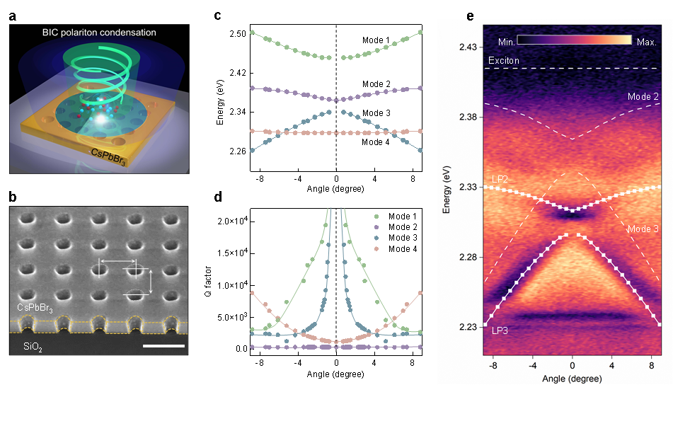 激子极化激元是由半导体激子与微腔光子强耦合形成的玻色子准粒子,在较高温度下即可实现非平衡的Bose-Einstein凝聚。其发射具有长程相干性,却无需粒子数反转,在低阈值激光光源开发中备受瞩目。BICs具备理论上无限高的腔品质因子、独特的非辐射特性和拓扑性质。与半导体激子强耦合形成的BIC激子极化激元,不仅能继承BICs的拓扑特性,还展现出在准粒子积累、强非线性相互作用和物性调控方面的巨大潜力。然而,基于传统半导体材料体系的BIC激子极化激元由于材料本身激子结合能较低,通常需要在低温下(液氦温度附近)工作,限制了其进一步应用。为应对该挑战,研究团队采用化学气相沉积法制备得到高质量钙钛矿单晶,后进行聚焦离子束刻蚀加工以构建二维准BIC结构的人工光子晶体。由于钙钛矿半导体单晶具有较大的激子结合能,存在室温下稳定的激子,成功实现了其与BIC腔光子间的强耦合,真空Rabi劈裂能大于150 meV。