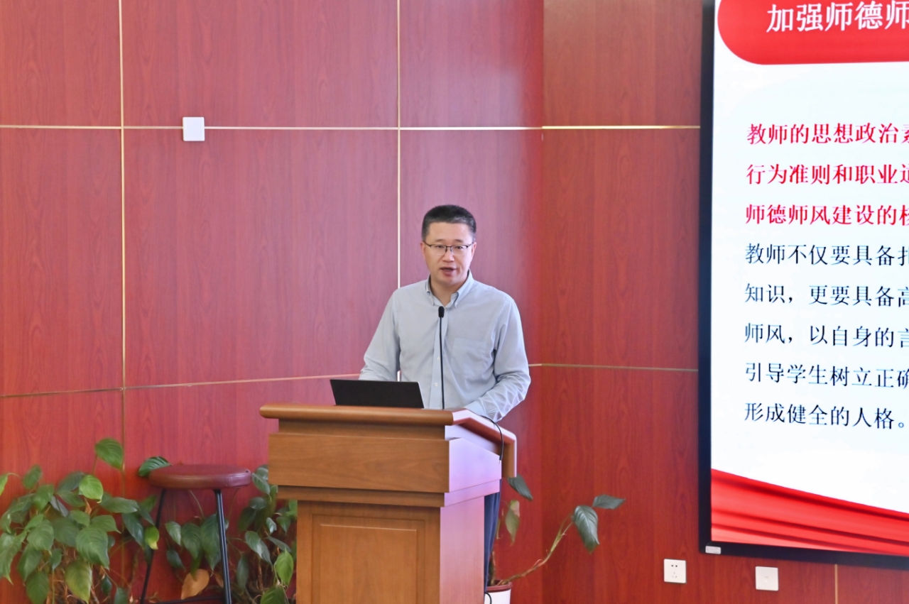 郭少军围绕师德师风的重要意义、教师行为规范与“十不得”、警示案例三个方面进行报告。他带领与会博士后重温习近平总书记关于师德师风的重要指示,学习党的二十大报告中的相关论述。他表示,加强师德师风建设是贯彻党的教育方针、建设新时代教师素质的关键,是提升人才培养质量的根本保证,是办好人民满意教育的首要任务,是评价教师队伍素质的第一标准。